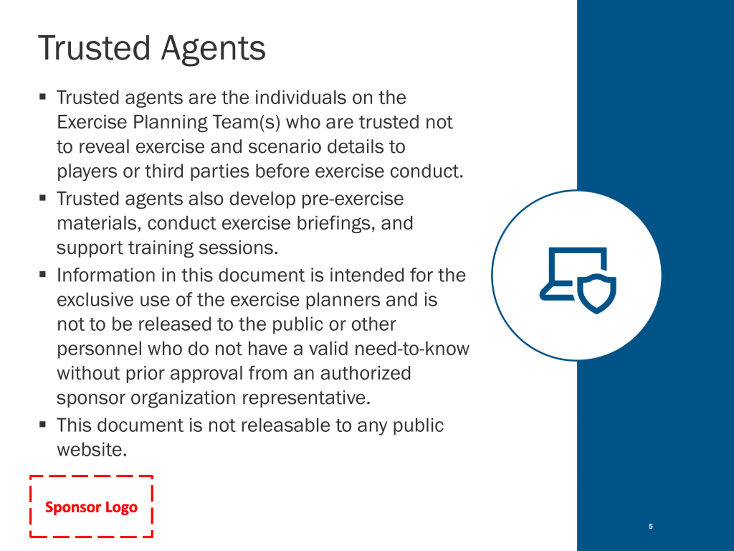 Trusted Agents Trusted agents are the individuals on the Exercise Planning Team(s) who are trusted not to reveal exercise and scenario details to players or third parties before exercise conduct. Trusted agents also develop pre-exercise materials, conduct exercise briefings, and support training sessions. Information in this document is intended for the exclusive use of the exercise planners and is not to be released to the public or other personnel who do not have a valid need-to-know without prior approval from an authorized sponsor organization representative. This document is not releasable to any public website. Sponsor Logo Sponsor Logo 5