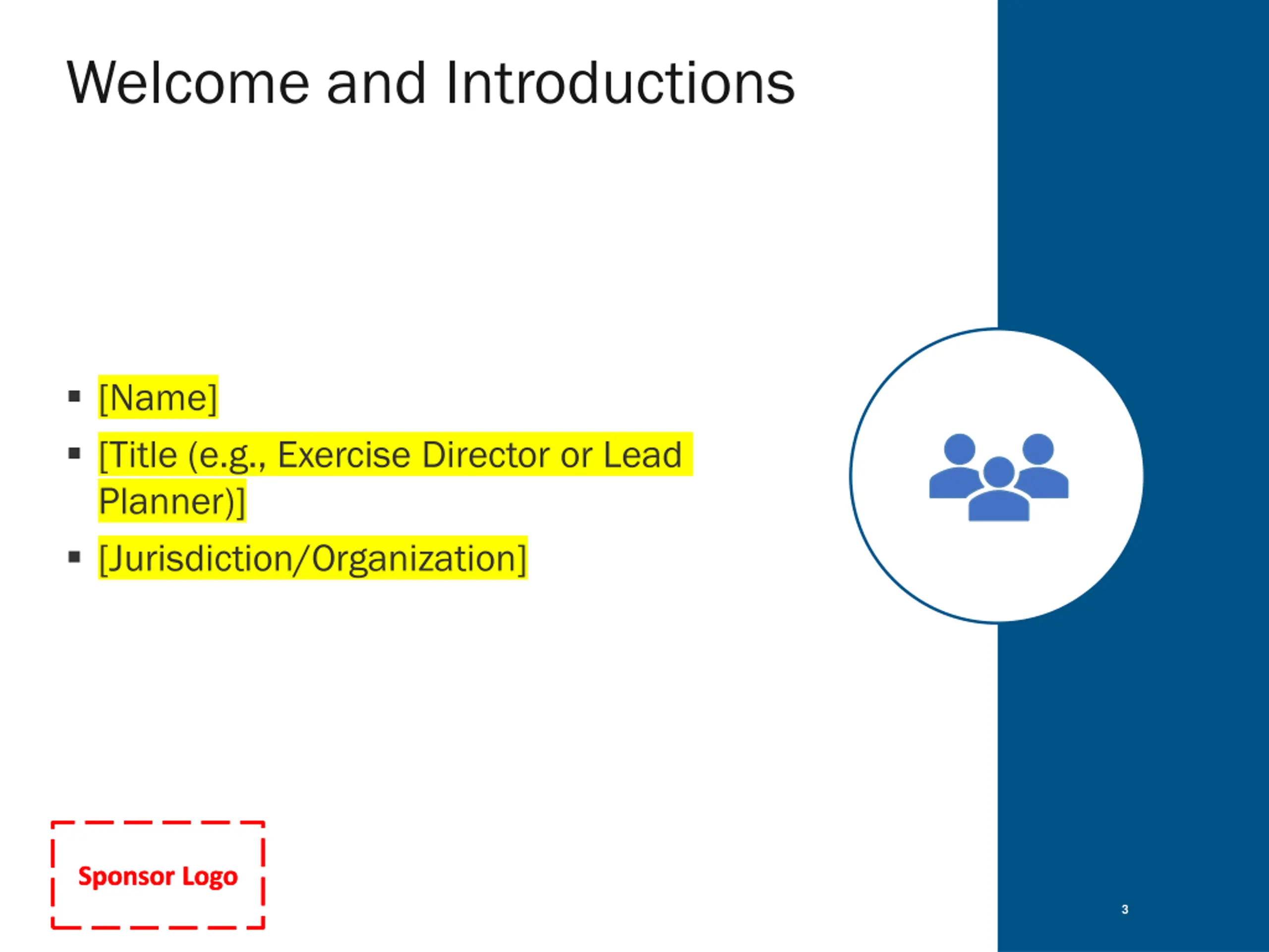 Welcome and Introductions [Name] [Title (e.g., Exercise Director or Lead Planner)] [Jurisdiction/Organization] Sponsor Logo Sponsor Logo 3