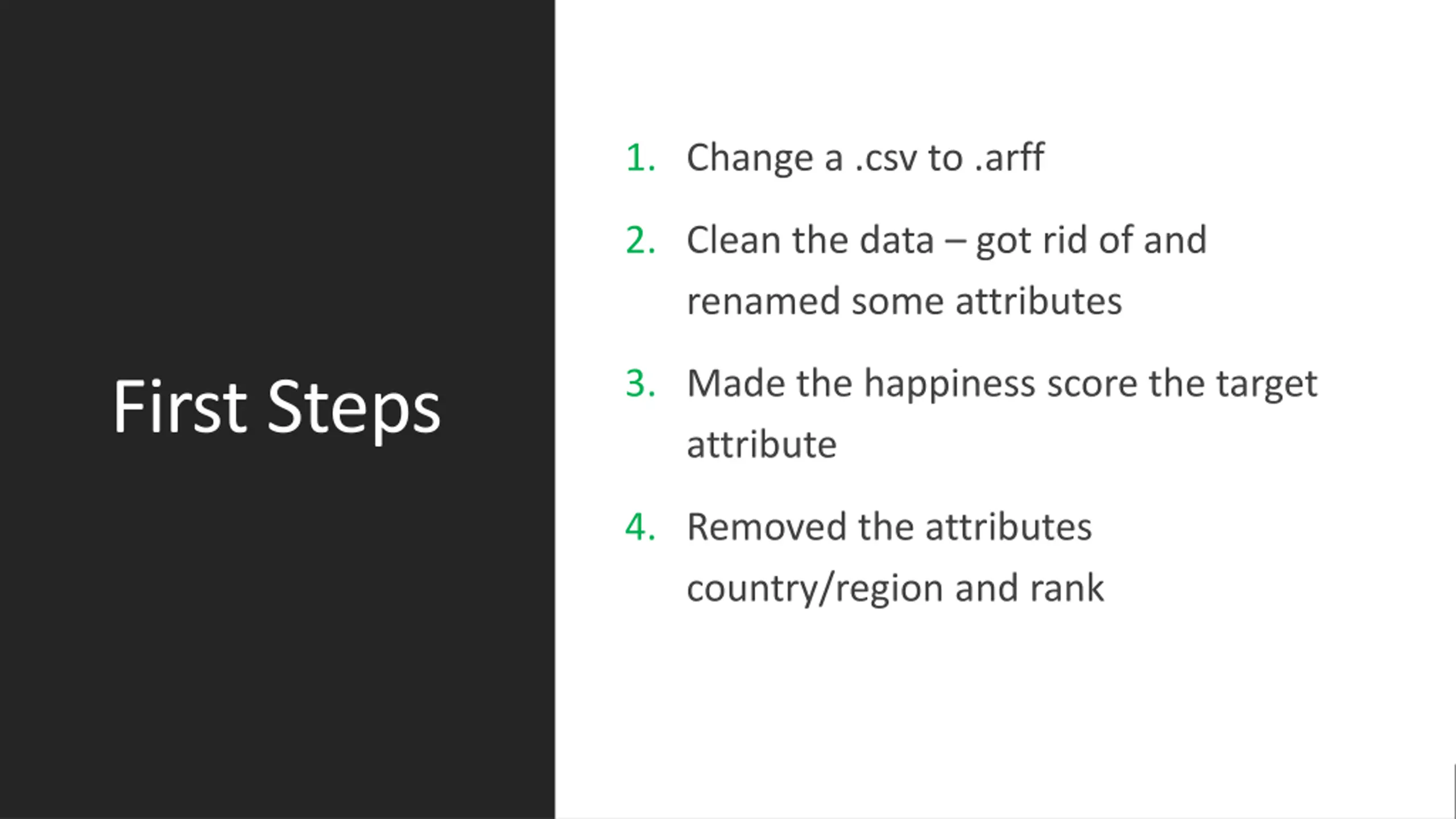 1. Change a .csv to .arff 2. Clean the data got rid of and renamed some attributes 3. Made the happiness score the target attribute First Steps 4. Removed the attributes country/region and rank