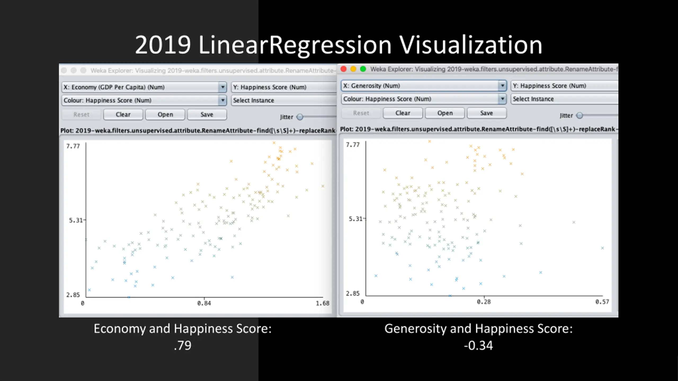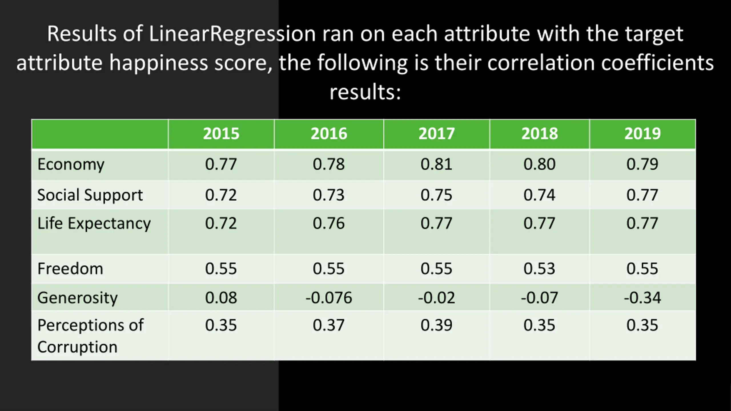 Results of LinearRegression ran on each attribute with the target attribute happiness score, the following is their correlation coefficients results: 2015 2016 2017 2018 2019 Economy 0.77 0.78 0.81 0.80 0.79 Social Support 0.72 0.73 0.75 0.74 0.77 Life Expectancy 0.72 0.76 0.77 0.77 0.77 Freedom 0.55 0.55 0.55 0.53 0.55 Generosity 0.08 -0.076 -0.02 -0.07 -0.34 Perceptions of Corruption 0.35 0.37 0.39 0.35 0.35