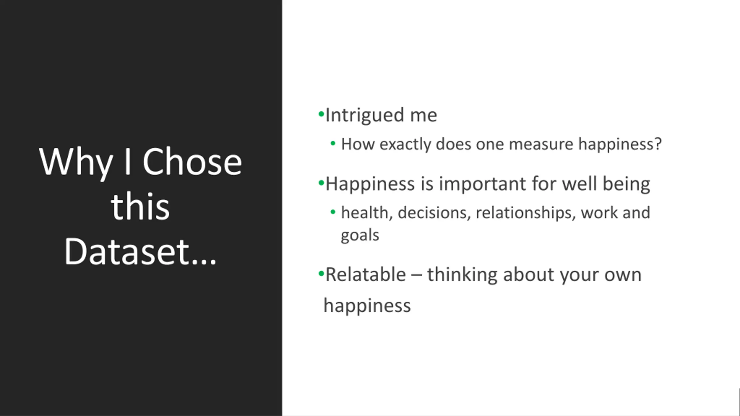 Intrigued me How exactly does one measure happiness? Why I Chose this Dataset Happiness is important for well being health, decisions, relationships, work and goals Relatable thinking about your own happiness