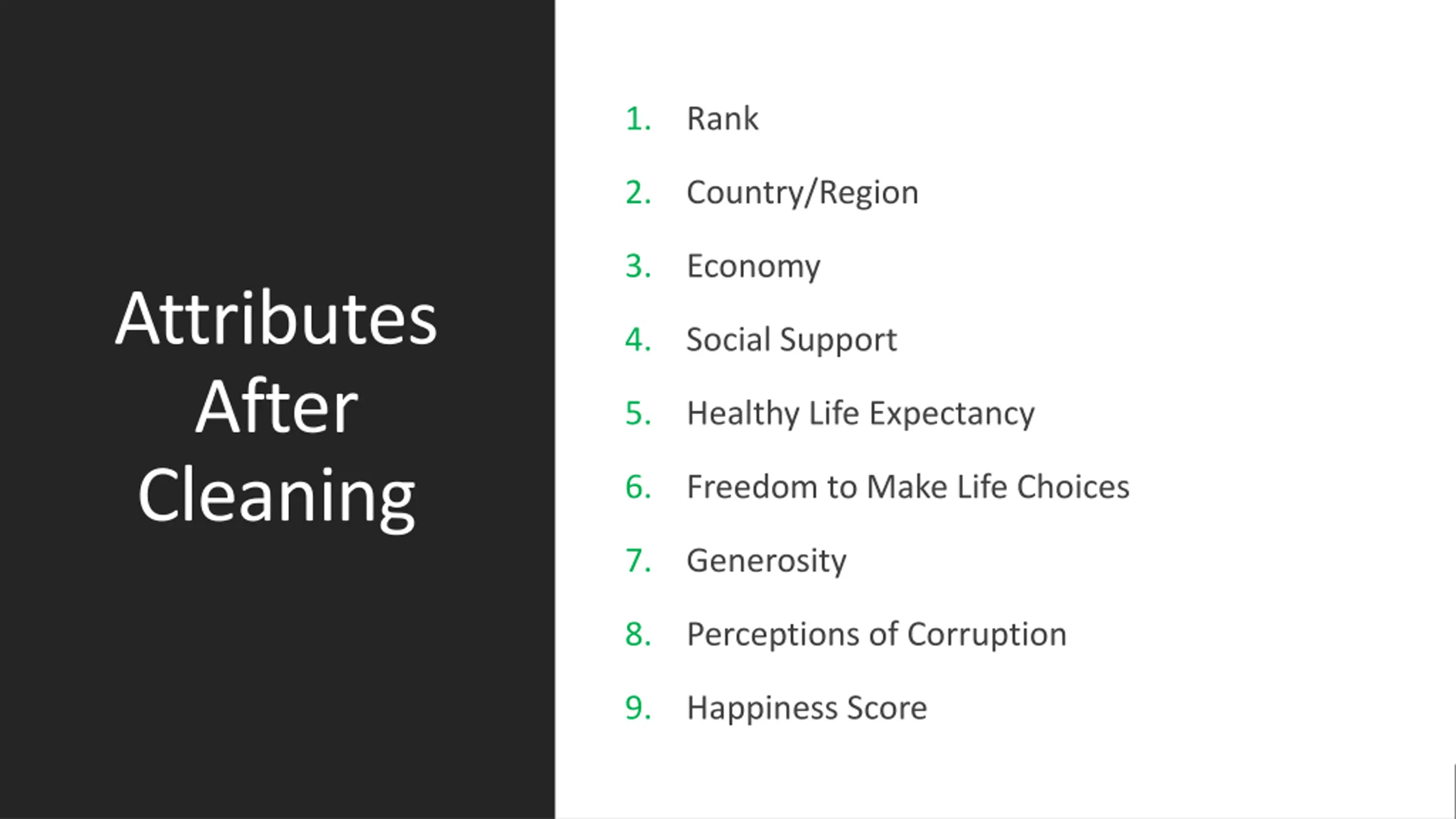 1. Rank 2. Country/Region 3. Economy Attributes After Cleaning 4. Social Support 5. Healthy Life Expectancy 6. Freedom to Make Life Choices 7. Generosity 8. Perceptions of Corruption 9. Happiness Score