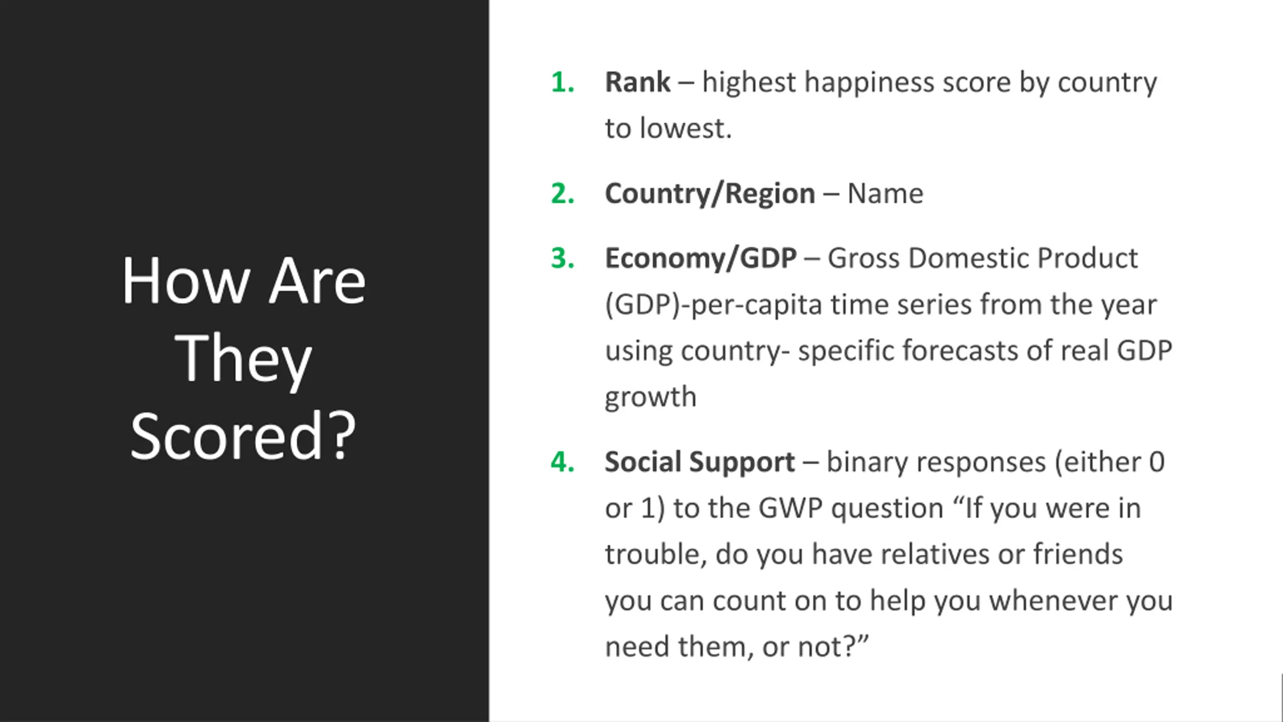 1. Rank highest happiness score by country to lowest. 2. Country/Region Name 3. Economy/GDP Gross Domestic Product (GDP)-per-capita time series from the year using country- specific forecasts of real GDP growth How Are They Scored? 4. Social Support binary responses (either 0 or 1) to the GWP question If you were in trouble, do you have relatives or friends you can count on to help you whenever you need them, or not?