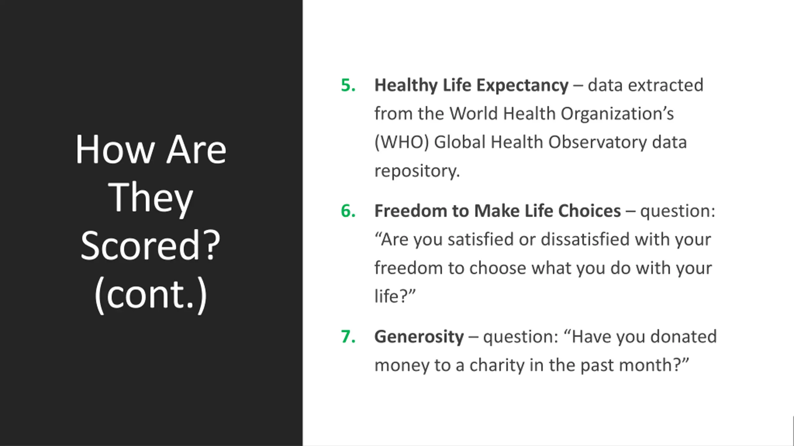 5. Healthy Life Expectancy data extracted from the World Health Organization s (WHO) Global Health Observatory data repository. How Are They Scored? (cont.) 6. Freedom to Make Life Choices question: Are you satisfied or dissatisfied with your freedom to choose what you do with your life? 7. Generosity question: Have you donated money to a charity in the past month?