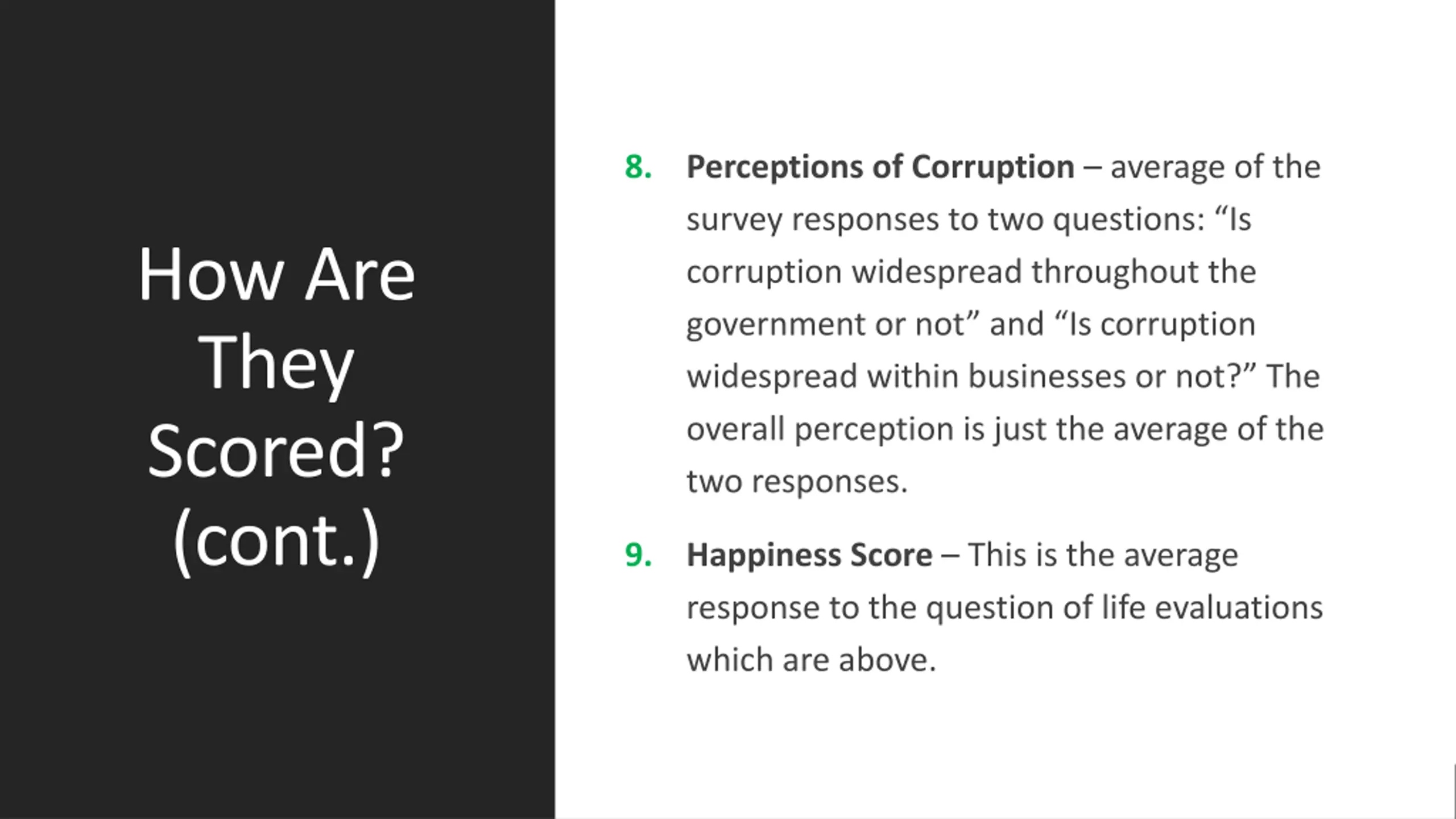 8. Perceptions of Corruption average of the survey responses to two questions: Is corruption widespread throughout the government or not and Is corruption widespread within businesses or not? The overall perception is just the average of the two responses. How Are They Scored? (cont.) 9. Happiness Score This is the average response to the question of life evaluations which are above.