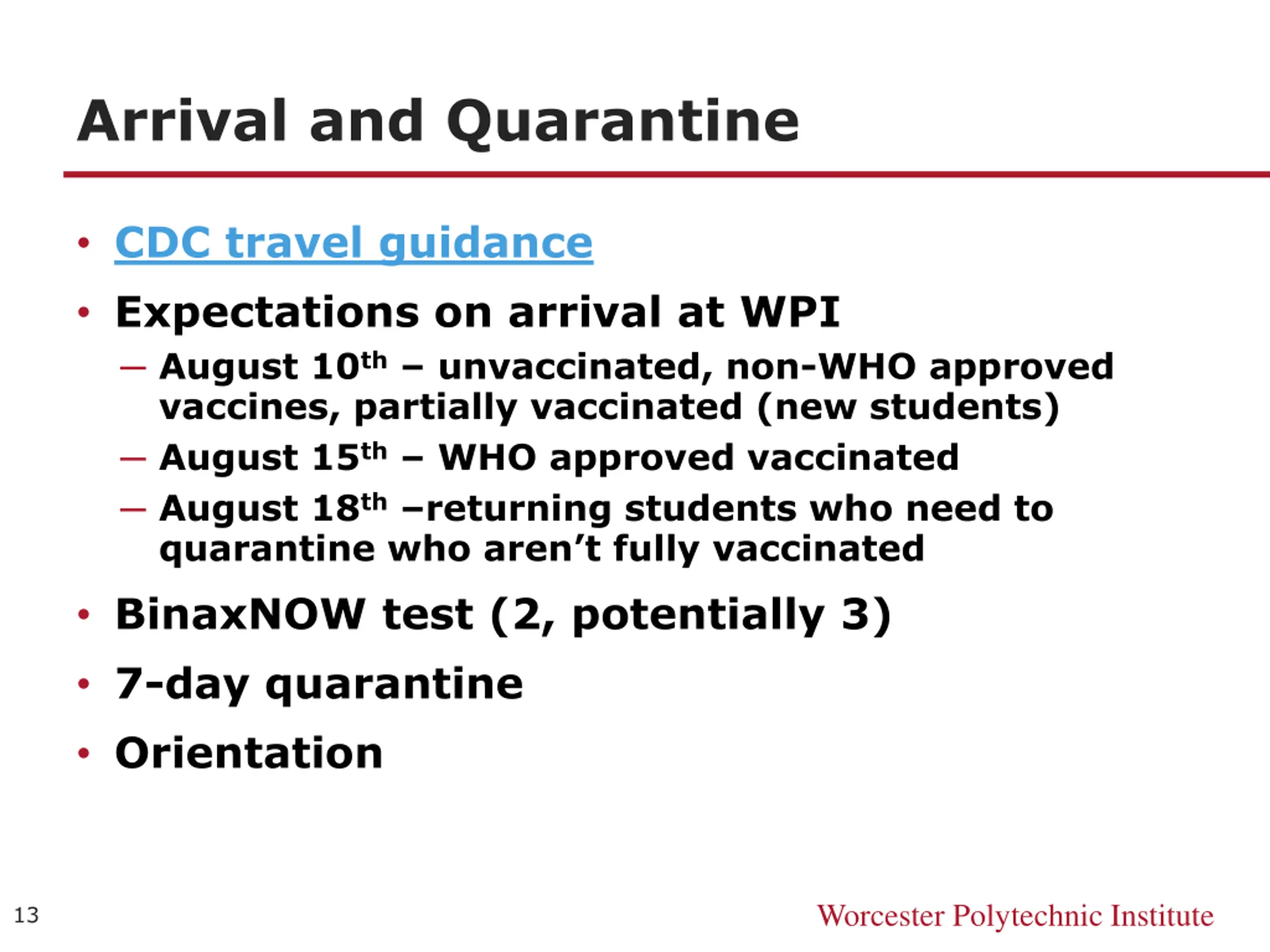 Arrival and Quarantine CDC travel guidance Expectations on arrival at WPI August 10th unvaccinated, non-WHO approved vaccines, partially vaccinated (new students) August 15th WHO approved vaccinated August 18th returning students who need to quarantine who aren t fully vaccinated BinaxNOW test (2, potentially 3) 7-day quarantine Orientation Worcester Polytechnic Institute 13