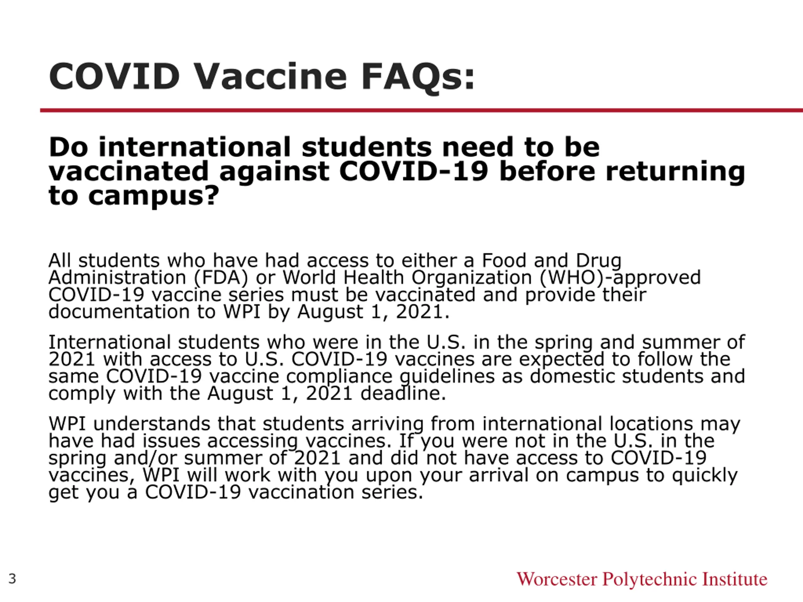 COVID Vaccine FAQs: Do international students need to be vaccinated against COVID-19 before returning to campus? All students who have had access to either a Food and Drug Administration (FDA) or World Health Organization (WHO)-approved COVID-19 vaccine series must be vaccinated and provide their documentation to WPI by August 1, 2021. International students who were in the U.S. in the spring and summer of 2021 with access to U.S. COVID-19 vaccines are expected to follow the same COVID-19 vaccine compliance guidelines as domestic students and comply with the August 1, 2021 deadline. WPI understands that students arriving from international locations may have had issues accessing vaccines. If you were not in the U.S. in the spring and/or summer of 2021 and did not have access to COVID-19 vaccines, WPI will work with you upon your arrival on campus to quickly get you a COVID-19 vaccination series. Worcester Polytechnic Institute 3