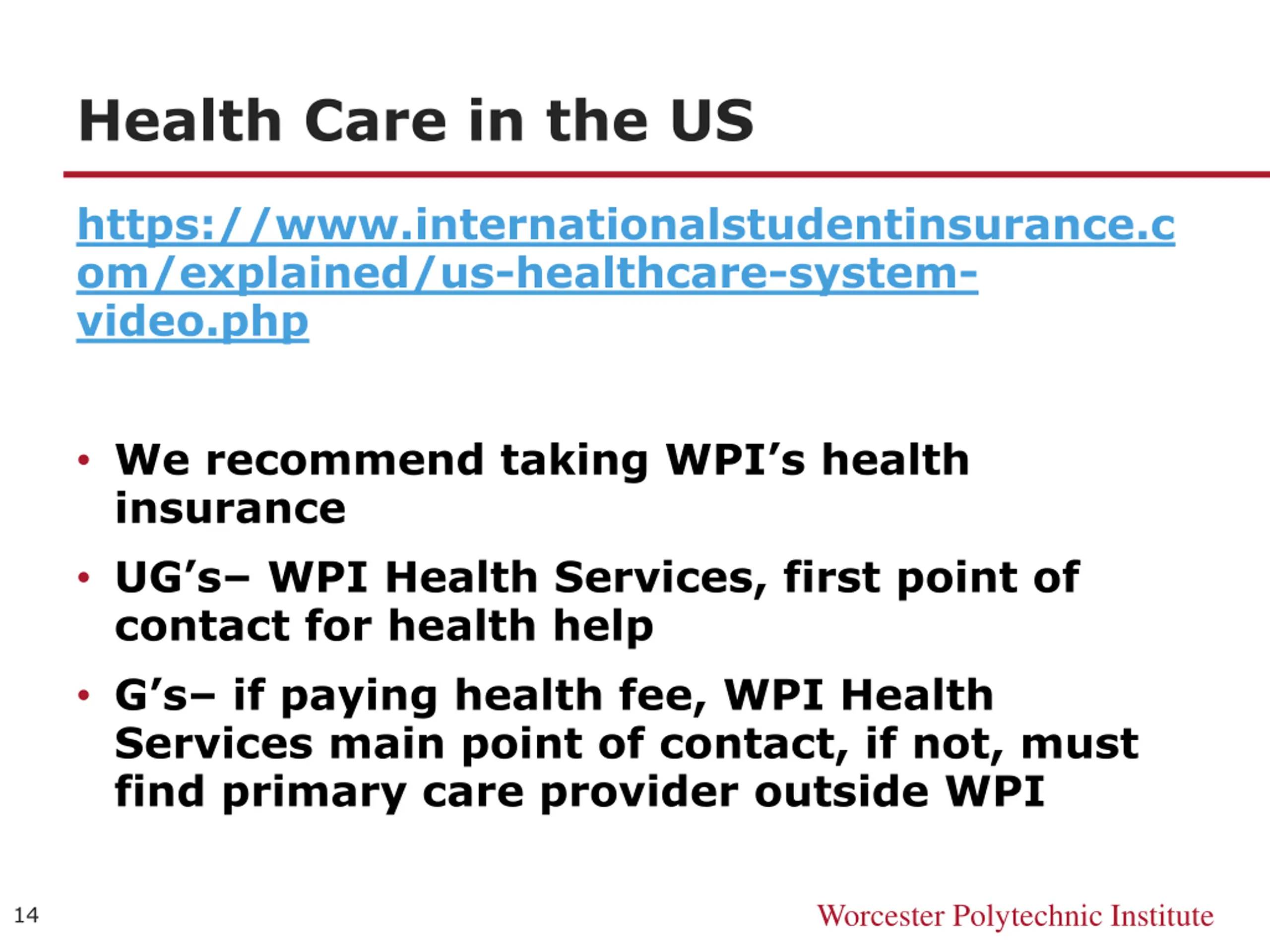 Health Care in the US https://www.internationalstudentinsurance.c om/explained/us-healthcare-system- video.php We recommend taking WPI s health insurance UG s WPI Health Services, first point of contact for health help G s if paying health fee, WPI Health Services main point of contact, if not, must find primary care provider outside WPI Worcester Polytechnic Institute 14
