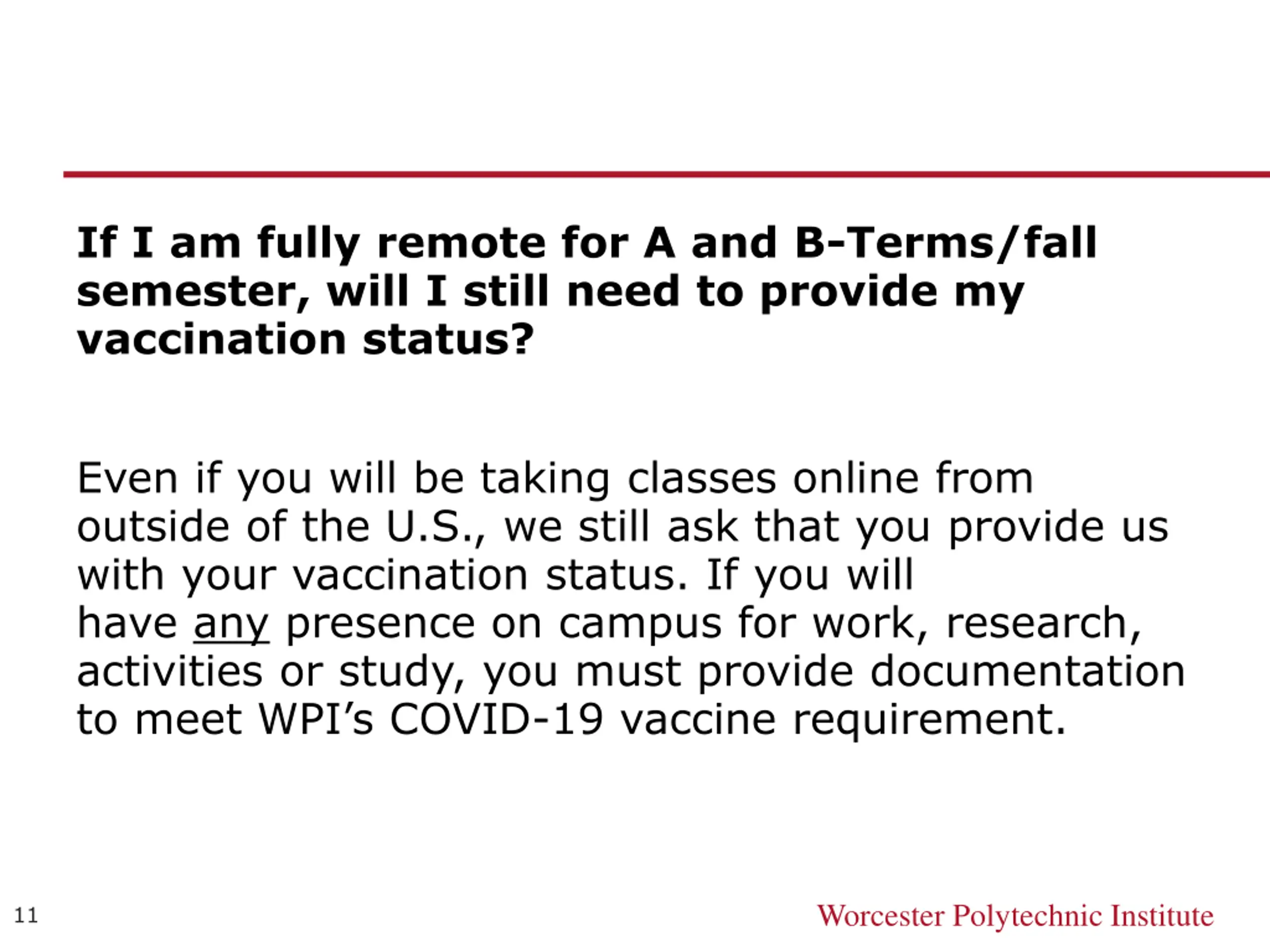 If I am fully remote for A and B-Terms/fall semester, will I still need to provide my vaccination status? Even if you will be taking classes online from outside of the U.S., we still ask that you provide us with your vaccination status. If you will have any presence on campus for work, research, activities or study, you must provide documentation to meet WPI s COVID-19 vaccine requirement. Worcester Polytechnic Institute 11