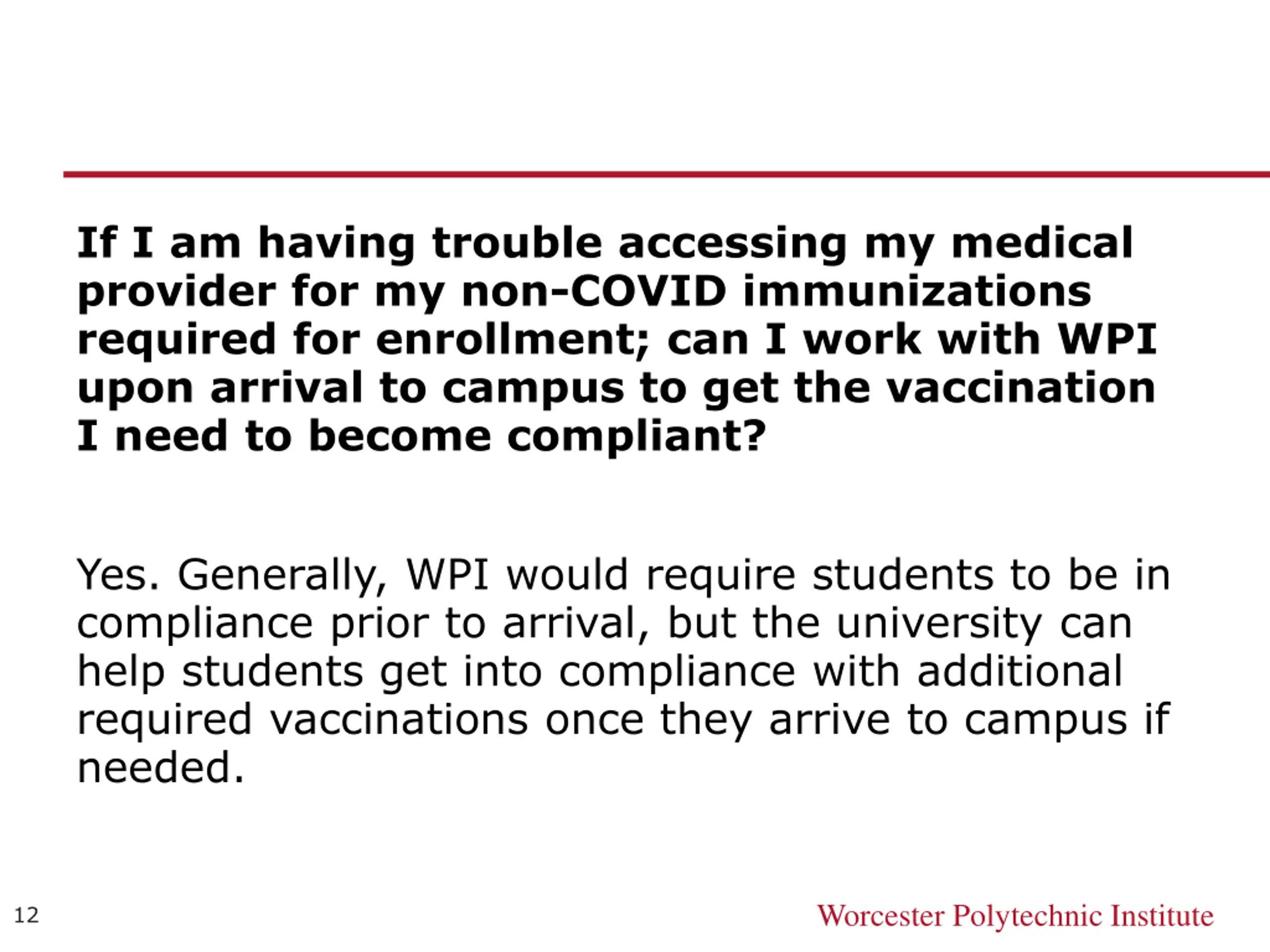 If I am having trouble accessing my medical provider for my non-COVID immunizations required for enrollment; can I work with WPI upon arrival to campus to get the vaccination I need to become compliant? Yes. Generally, WPI would require students to be in compliance prior to arrival, but the university can help students get into compliance with additional required vaccinations once they arrive to campus if needed. Worcester Polytechnic Institute 12