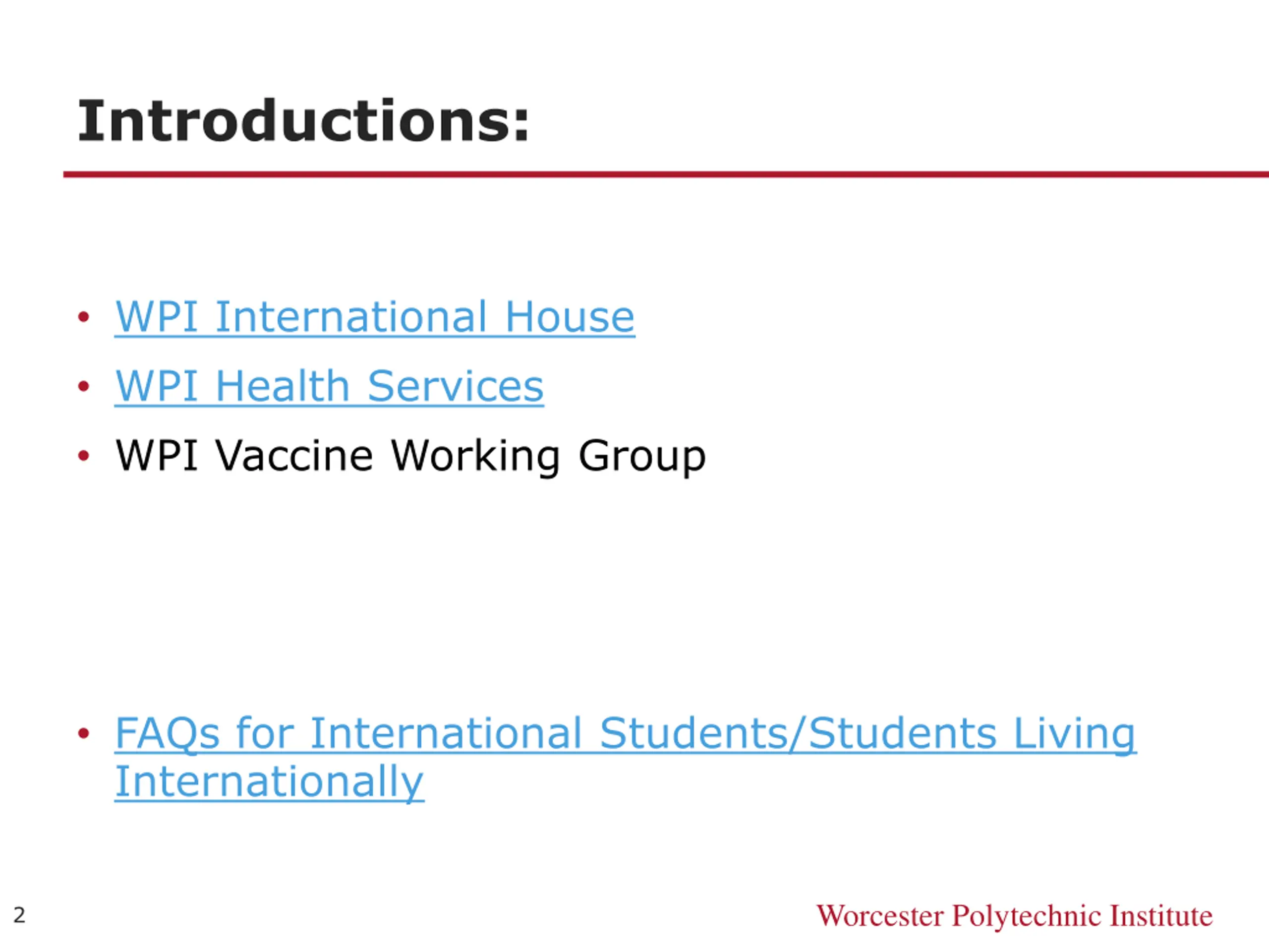 Introductions: WPI International House WPI Health Services WPI Vaccine Working Group FAQs for International Students/Students Living Internationally Worcester Polytechnic Institute 2
