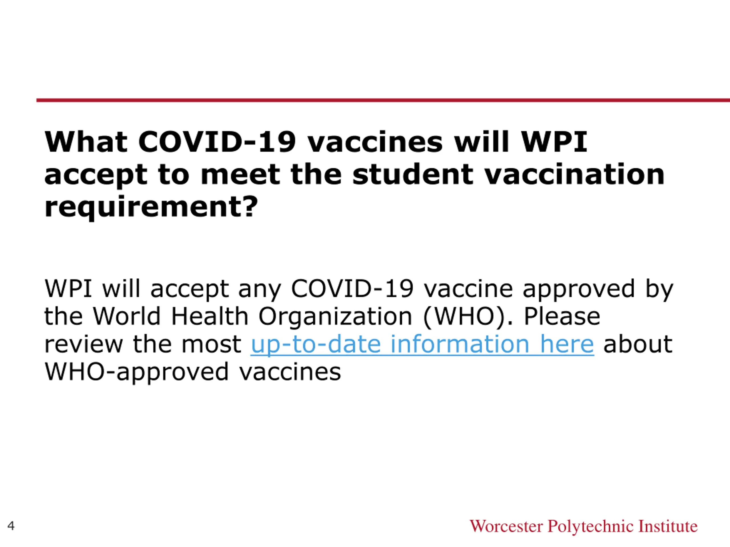 What COVID-19 vaccines will WPI accept to meet the student vaccination requirement? WPI will accept any COVID-19 vaccine approved by the World Health Organization (WHO). Please review the most up-to-date information here about WHO-approved vaccines Worcester Polytechnic Institute 4