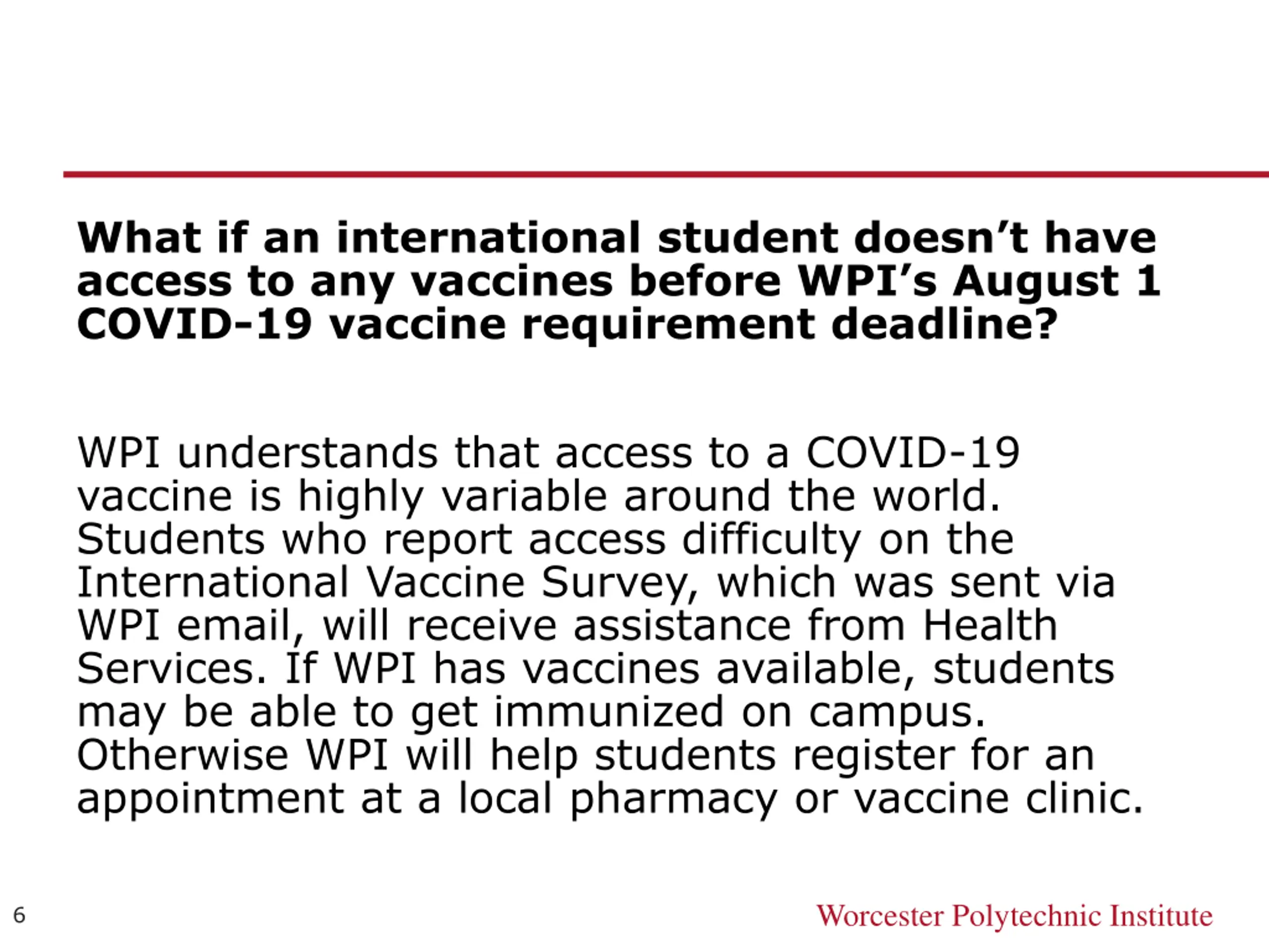 What if an international student doesnt have access to any vaccines before WPI s August 1 COVID-19 vaccine requirement deadline? WPI understands that access to a COVID-19 vaccine is highly variable around the world. Students who report access difficulty on the International Vaccine Survey, which was sent via WPI email, will receive assistance from Health Services. If WPI has vaccines available, students may be able to get immunized on campus. Otherwise WPI will help students register for an appointment at a local pharmacy or vaccine clinic. Worcester Polytechnic Institute 6