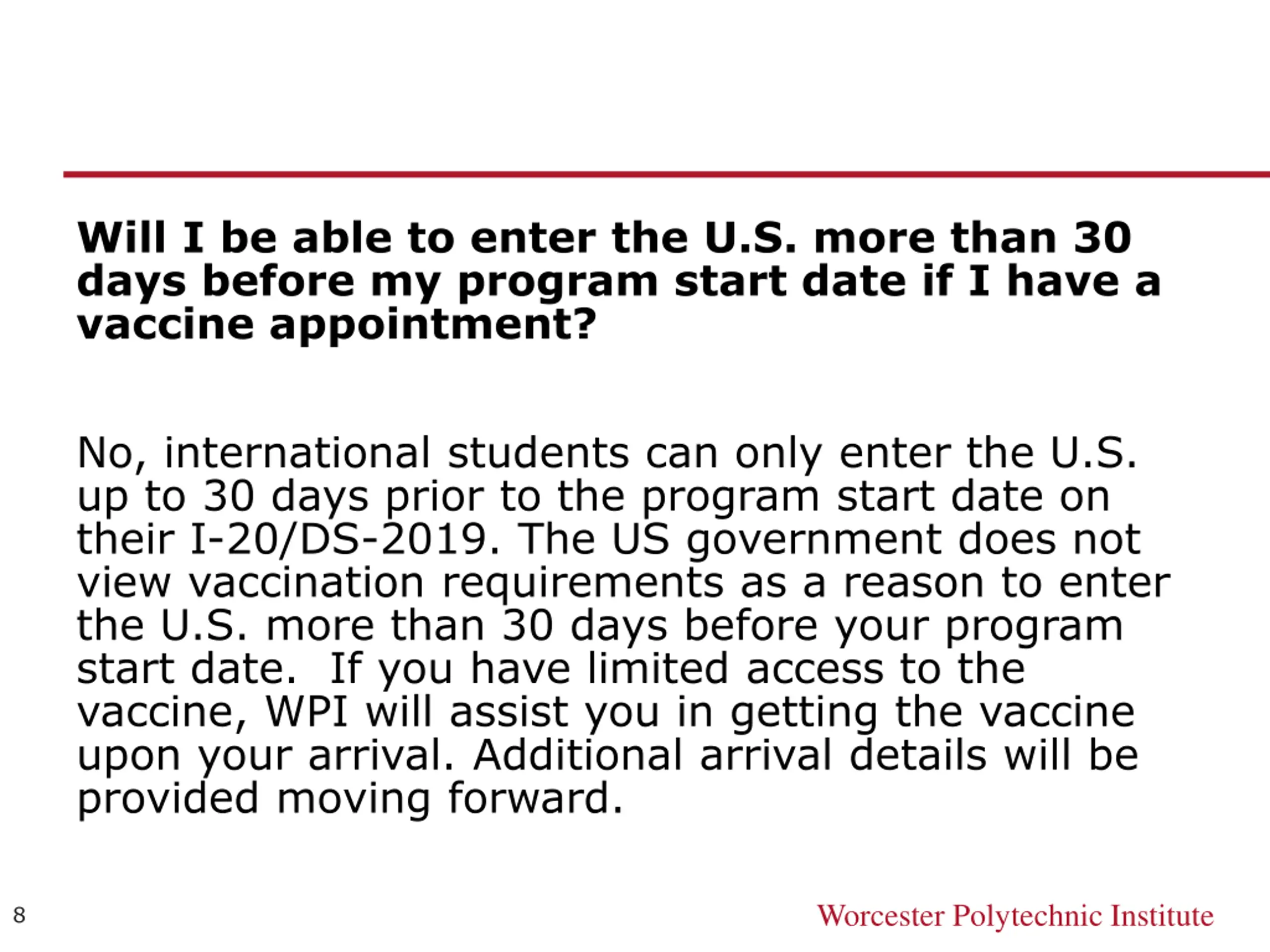 Will I be able to enter the U.S. more than 30 days before my program start date if I have a vaccine appointment? No, international students can only enter the U.S. up to 30 days prior to the program start date on their I-20/DS-2019. The US government does not view vaccination requirements as a reason to enter the U.S. more than 30 days before your program start date. If you have limited access to the vaccine, WPI will assist you in getting the vaccine upon your arrival. Additional arrival details will be provided moving forward. Worcester Polytechnic Institute 8
