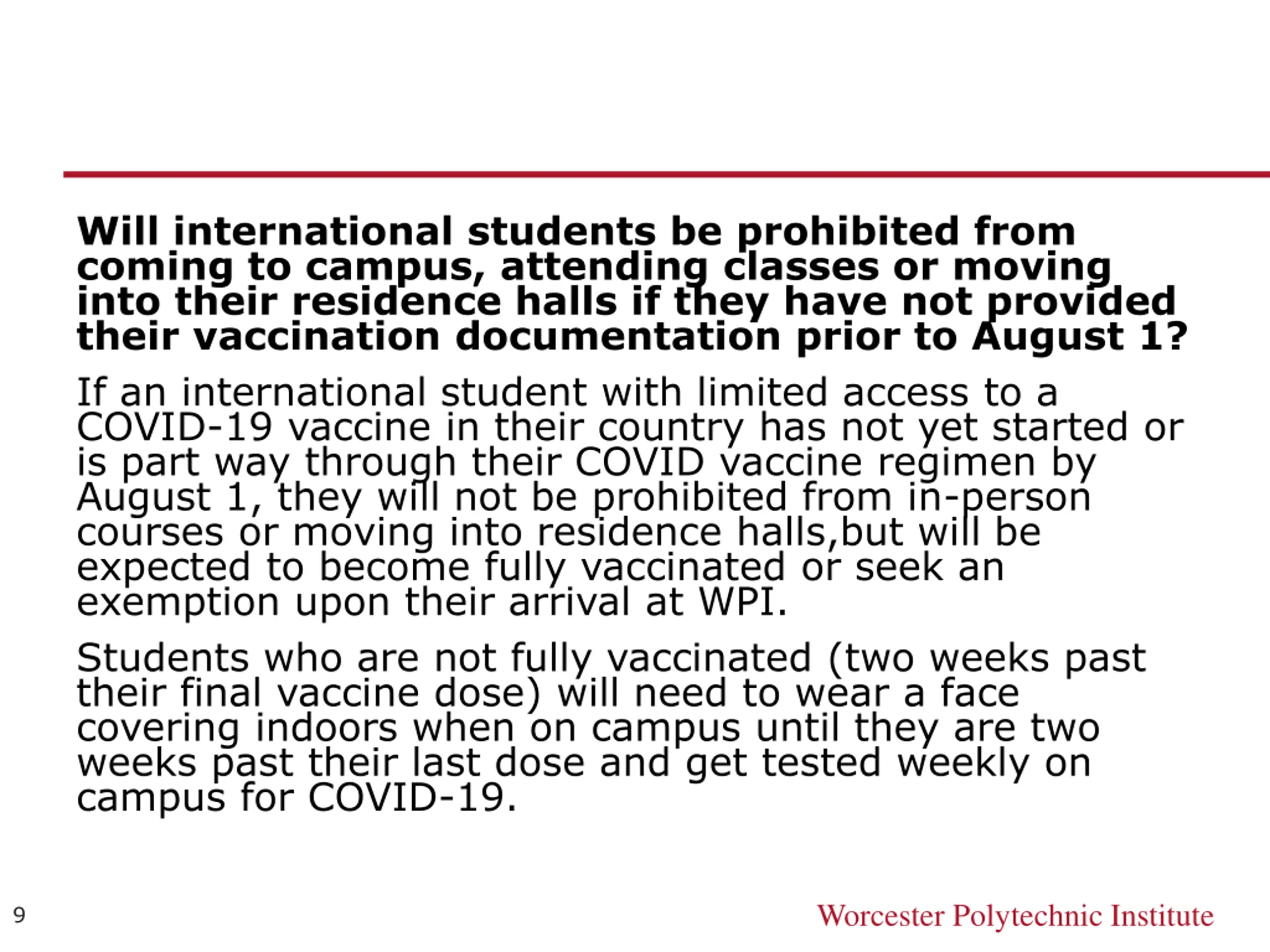 Will international students be prohibited from coming to campus, attending classes or moving into their residence halls if they have not provided their vaccination documentation prior to August 1? If an international student with limited access to a COVID-19 vaccine in their country has not yet started or is part way through their COVID vaccine regimen by August 1, they will not be prohibited from in-person courses or moving into residence halls,but will be expected to become fully vaccinated or seek an exemption upon their arrival at WPI. Students who are not fully vaccinated (two weeks past their final vaccine dose) will need to wear a face covering indoors when on campus until they are two weeks past their last dose and get tested weekly on campus for COVID-19. Worcester Polytechnic Institute 9