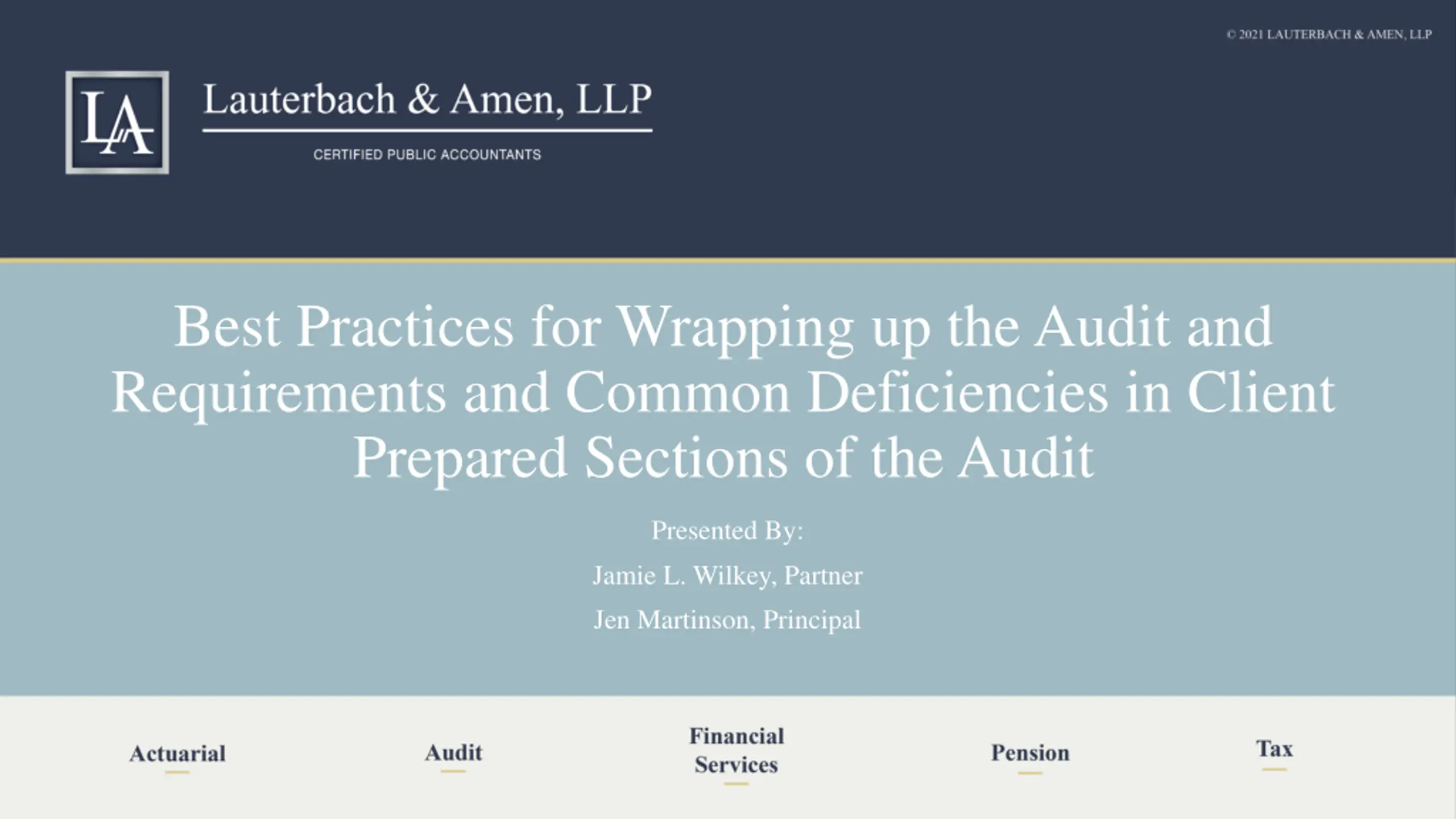 Best Practices for Wrapping up the Audit and Requirements and Common Deficiencies in Client Prepared Sections of the Audit Presented By: Jamie L. Wilkey, Partner Jen Martinson, Principal