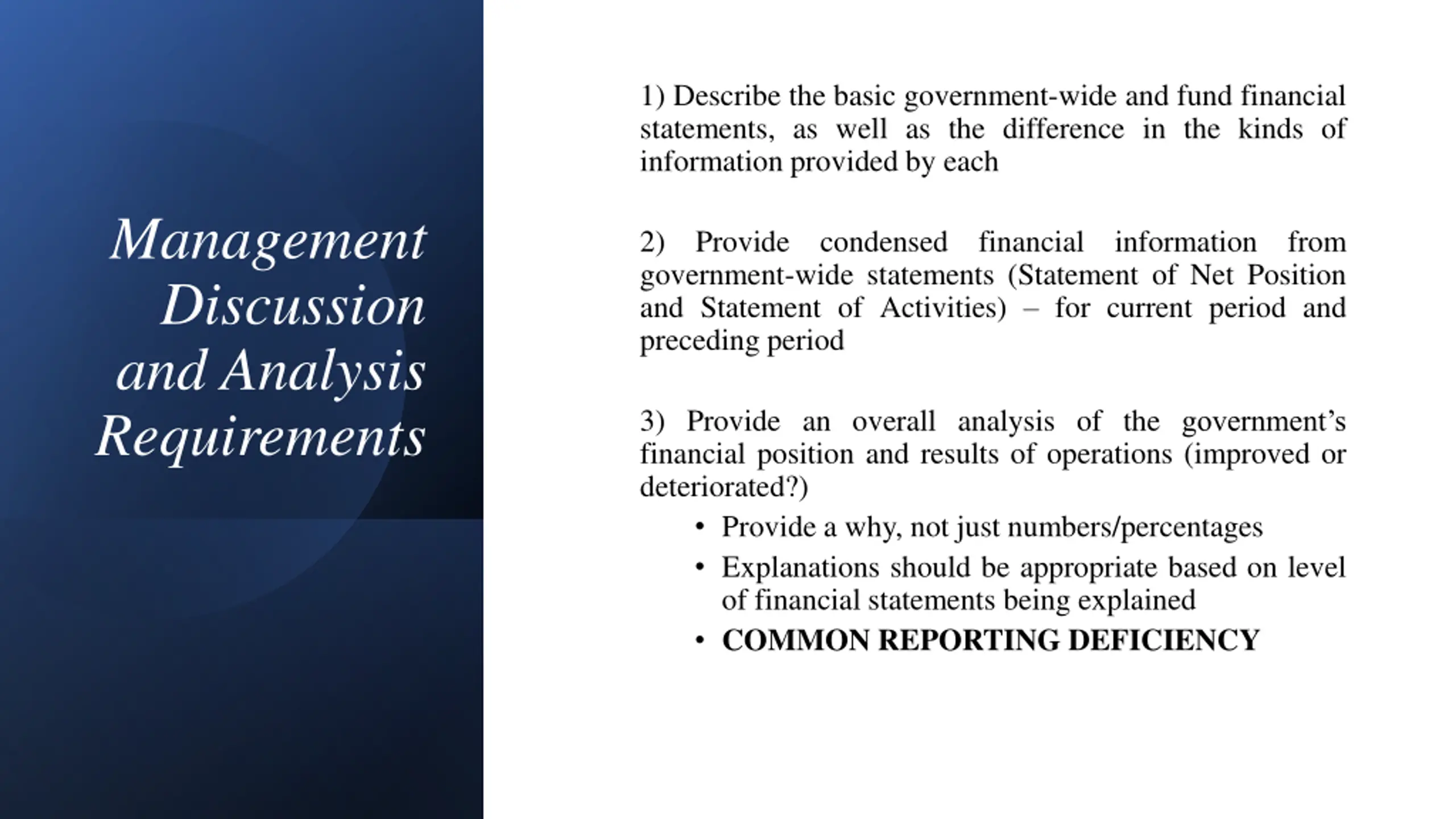 1) Describe the basic government-wide and fund financial statements, as well as the difference in the kinds of information provided by each Management Discussion and Analysis Requirements 2) government-wide statements (Statement of Net Position and Statement of Activities) for current period and preceding period Provide condensed financial information from 3) Provide an overall analysis of the government s financial position and results of operations (improved or deteriorated?) Provide a why, not just numbers/percentages Explanations should be appropriate based on level of financial statements being explained COMMON REPORTING DEFICIENCY