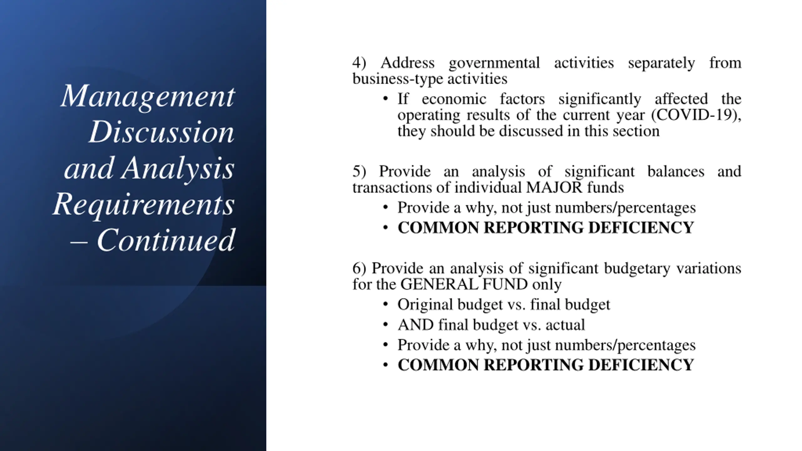 4) Address governmental activities separately from business-type activities If economic factors significantly affected the operating results of the current year (COVID-19), they should be discussed in this section Management Discussion and Analysis Requirements Continued 5) Provide an analysis of significant balances and transactions of individual MAJOR funds Provide a why, not just numbers/percentages COMMON REPORTING DEFICIENCY 6) Provide an analysis of significant budgetary variations for the GENERAL FUND only Original budget vs. final budget AND final budget vs. actual Provide a why, not just numbers/percentages COMMON REPORTING DEFICIENCY