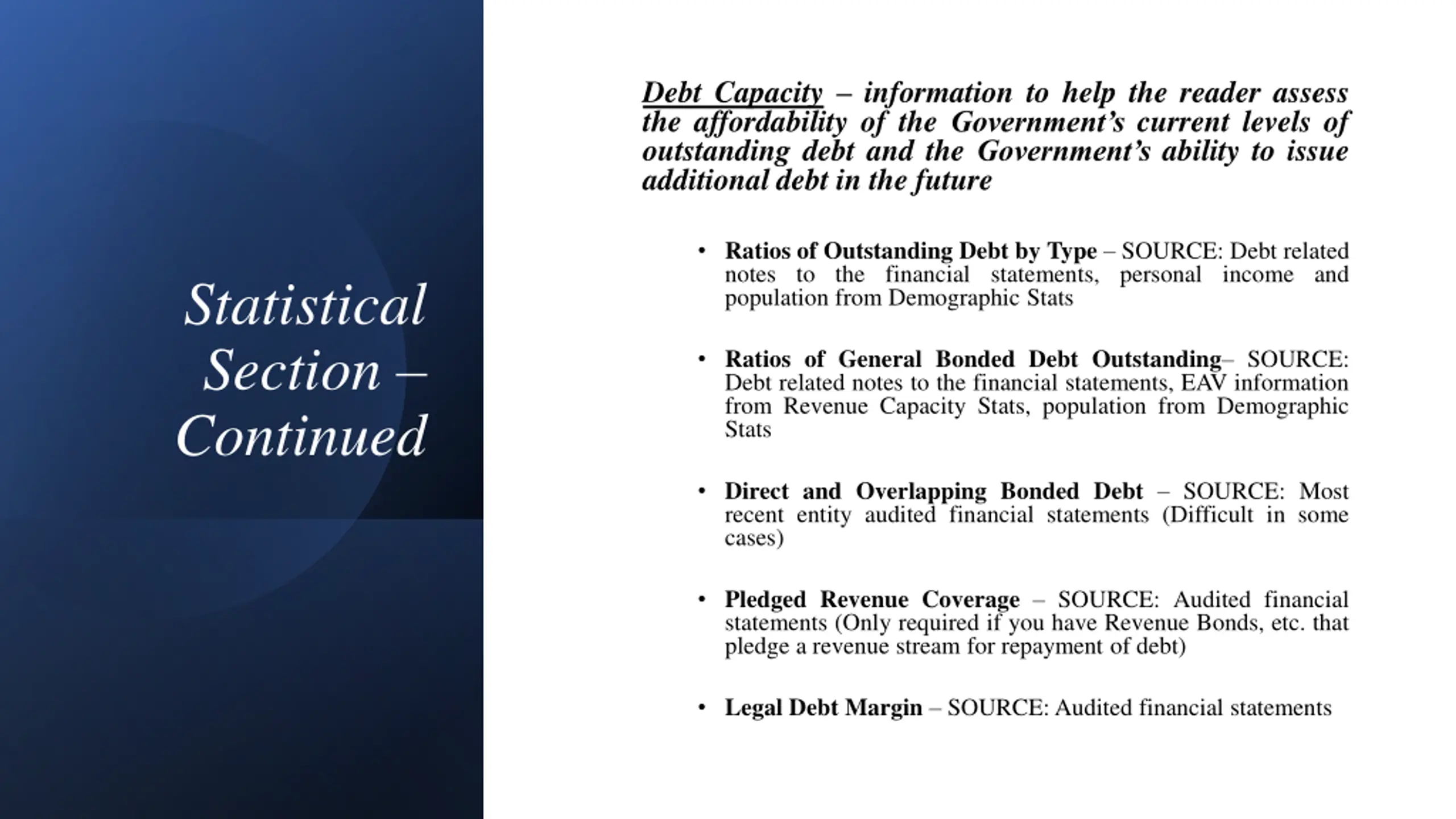 Debt Capacity information to help the reader assess the affordability of the Government s current levels of outstanding debt and the Government s ability to issue additional debt in the future Ratios of Outstanding Debt by Type SOURCE: Debt related notes to the financial statements, personal income and population from Demographic Stats Statistical Section Continued Ratios of General Bonded Debt Outstanding SOURCE: Debt related notes to the financial statements, EAV information from Revenue Capacity Stats, population from Demographic Stats Direct and Overlapping Bonded Debt SOURCE: Most recent entity audited financial statements (Difficult in some cases) Pledged Revenue Coverage SOURCE: Audited financial statements (Only required if you have Revenue Bonds, etc. that pledge a revenue stream for repayment of debt) Legal Debt Margin SOURCE:Audited financial statements