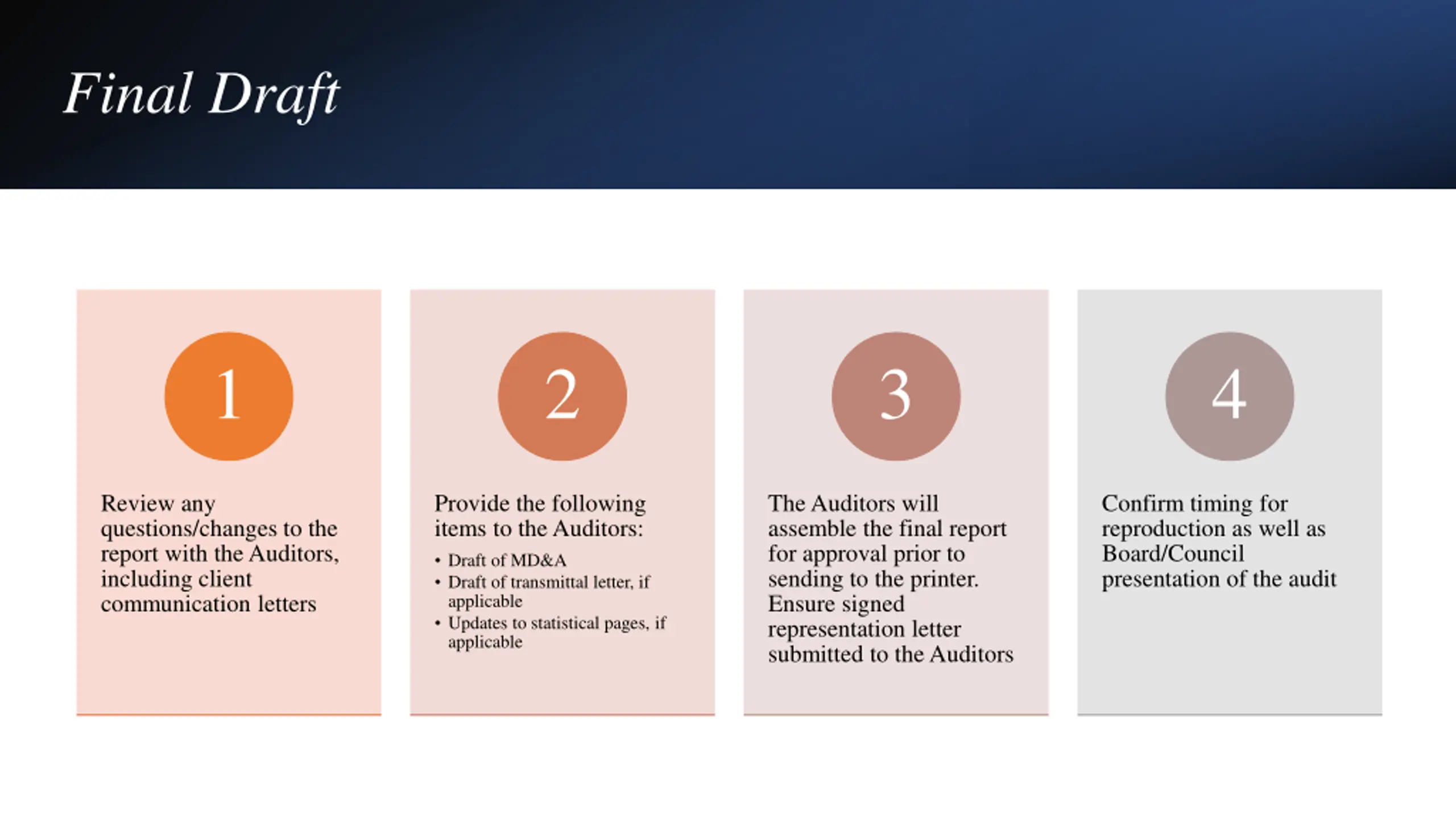 Final Draft 1 2 3 4 Review any questions/changes to the report with the Auditors, including client communication letters Provide the following items to the Auditors: Draft of MD&A Draft of transmittal letter, if applicable Updates to statistical pages, if applicable The Auditors will assemble the final report for approval prior to sending to the printer. Ensure signed representation letter submitted to the Auditors Confirm timing for reproduction as well as Board/Council presentation of the audit