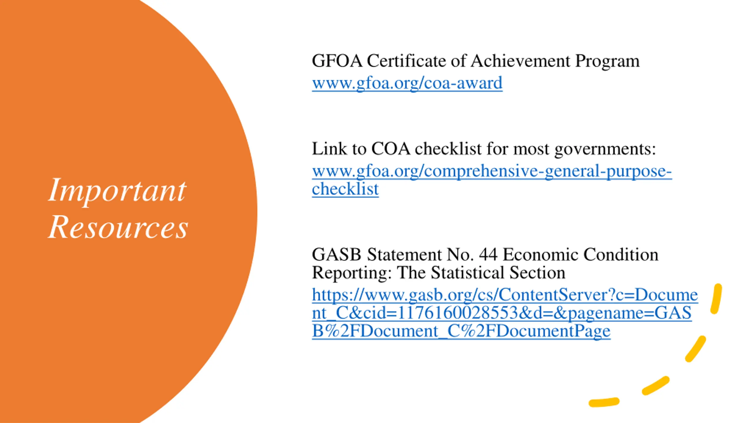 GFOA Certificate of Achievement Program www.gfoa.org/coa-award Link to COA checklist for most governments: www.gfoa.org/comprehensive-general-purpose- checklist Important Resources GASB Statement No. 44 Economic Condition Reporting: The Statistical Section https://www.gasb.org/cs/ContentServer?c=Docume nt_C&cid=1176160028553&d=&pagename=GAS B%2FDocument_C%2FDocumentPage