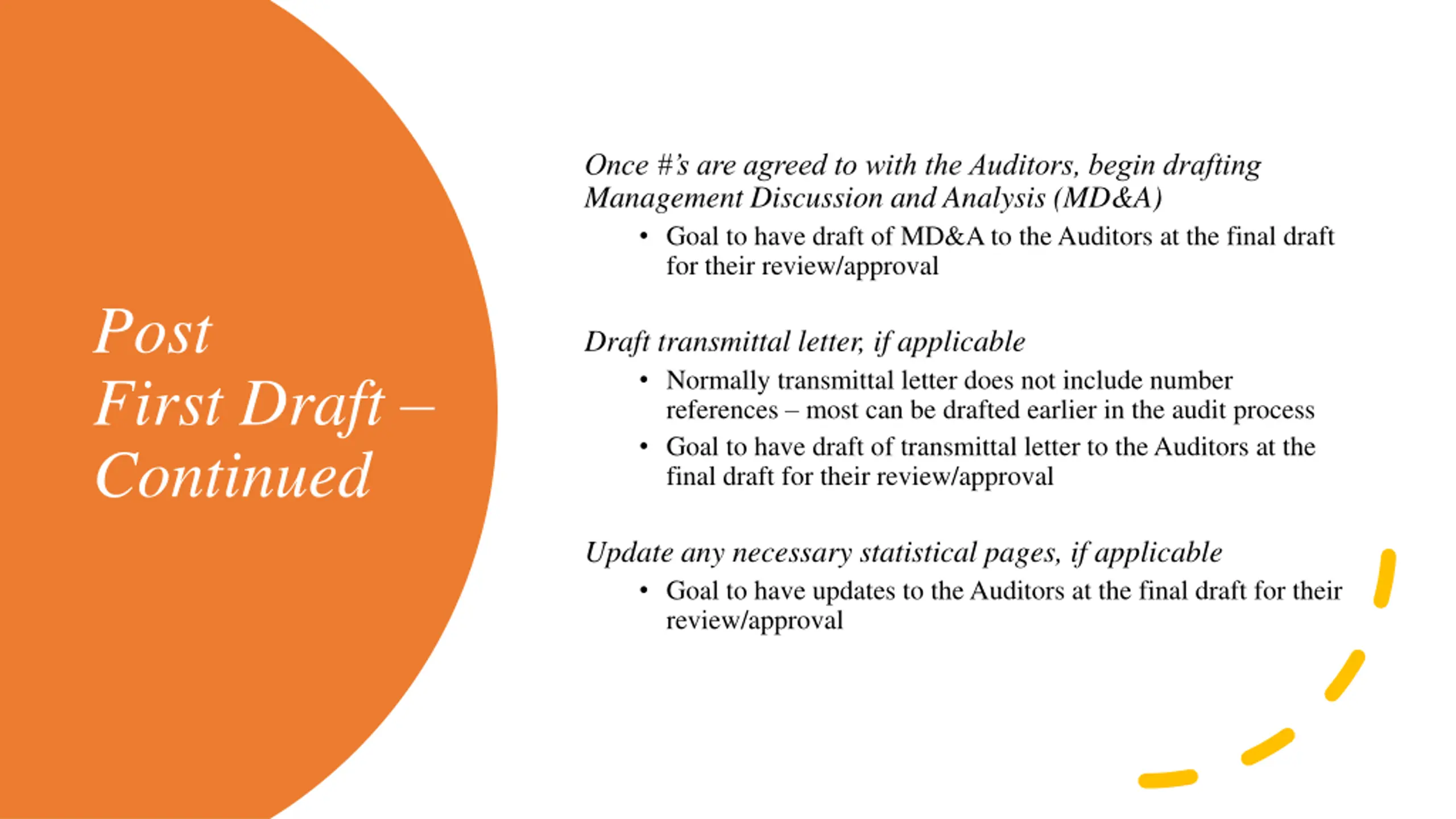 Once #s are agreed to with the Auditors, begin drafting Management Discussion and Analysis (MD&A) Goal to have draft of MD&A to the Auditors at the final draft for their review/approval Post First Draft Continued Draft transmittal letter, if applicable Normally transmittal letter does not include number references most can be drafted earlier in the audit process Goal to have draft of transmittal letter to the Auditors at the final draft for their review/approval Update any necessary statistical pages, if applicable Goal to have updates to the Auditors at the final draft for their review/approval