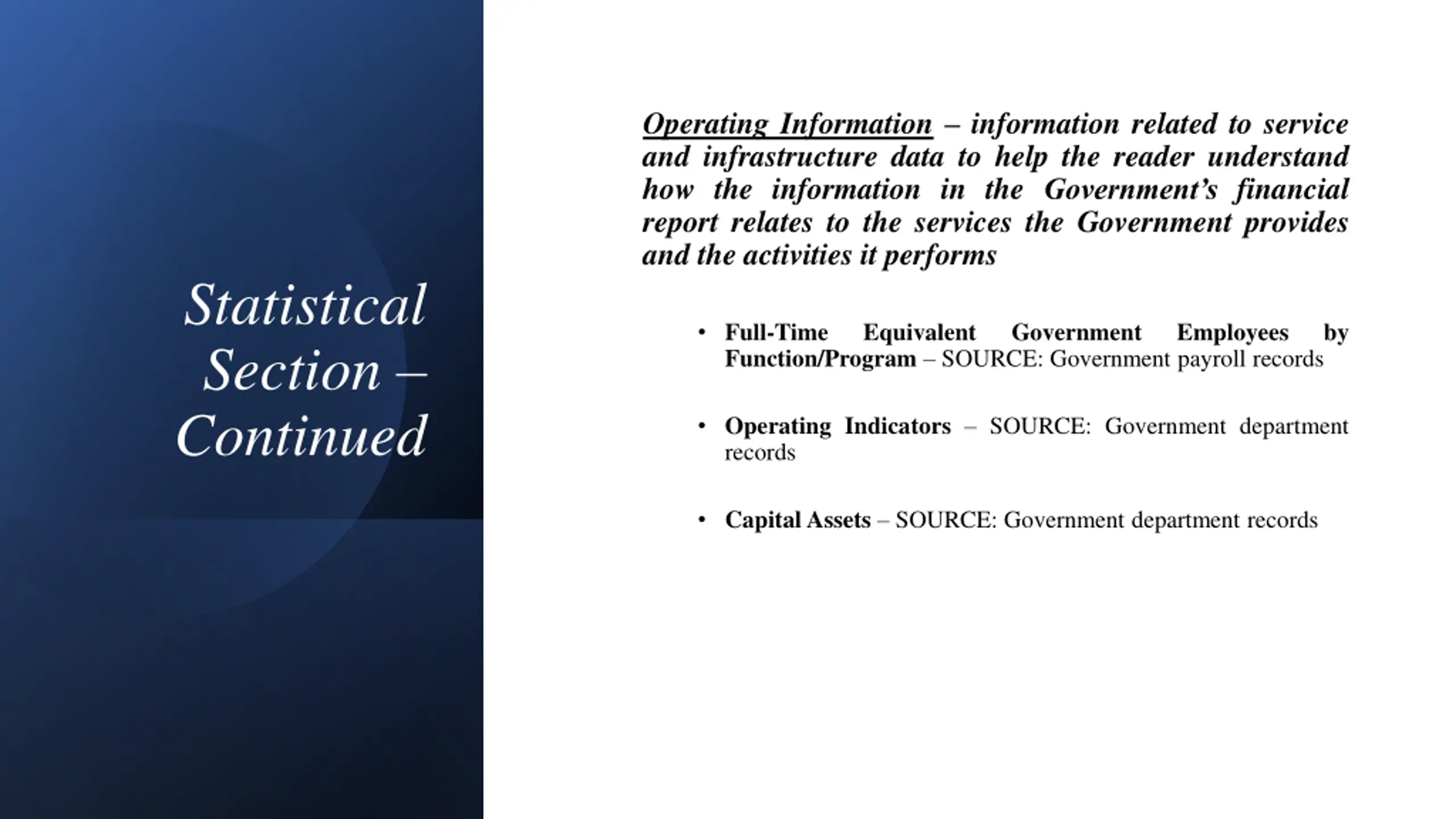 Operating Information information related to service and infrastructure data to help the reader understand how the information in the Government s financial report relates to the services the Government provides and the activities it performs Statistical Section Continued Full-Time Function/Program SOURCE: Government payroll records Equivalent Government Employees by Operating Indicators SOURCE: Government department records Capital Assets SOURCE: Government department records