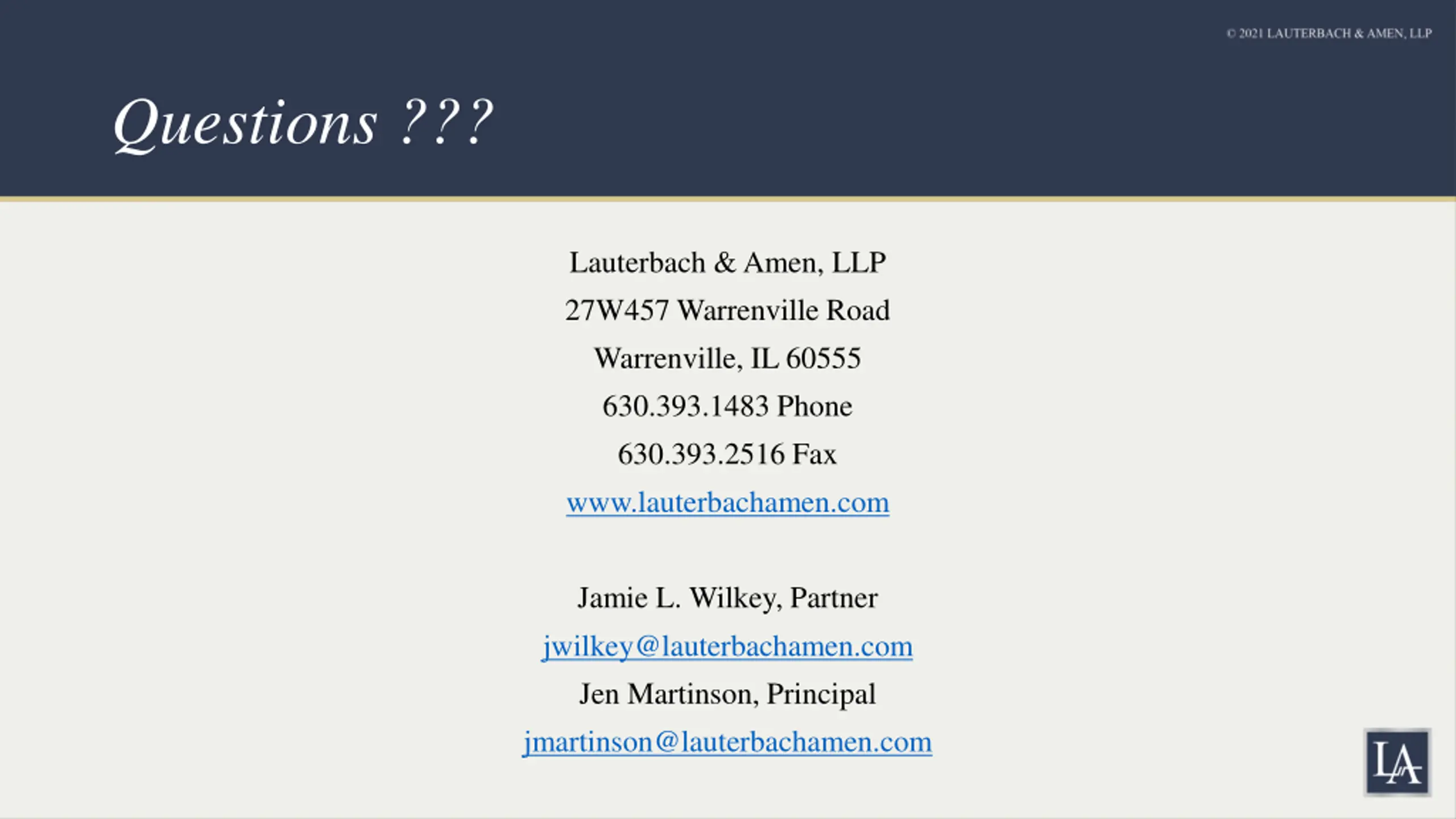 Questions ??? Lauterbach & Amen, LLP 27W457 Warrenville Road Warrenville, IL 60555 630.393.1483 Phone 630.393.2516 Fax www.lauterbachamen.com Jamie L. Wilkey, Partner jwilkey@lauterbachamen.com Jen Martinson, Principal jmartinson@lauterbachamen.com