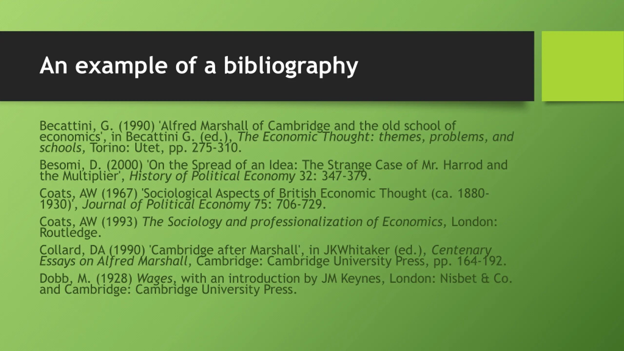 An example of a bibliography Becattini, G. (1990) 'Alfred Marshall of Cambridge and the old school of economics', in Becattini G. (ed.), The Economic Thought: themes, problems, and schools, Torino: Utet, pp. 275-310. Besomi, D. (2000) 'On the Spread of an Idea: The Strange Case of Mr. Harrod and the Multiplier', History of Political Economy 32: 347-379. Coats, AW (1967) 'Sociological Aspects of British Economic Thought (ca. 1880- 1930)', Journal of Political Economy 75: 706-729. Coats, AW (1993) The Sociology and professionalization of Economics, London: Routledge. Collard, DA (1990) 'Cambridge after Marshall', in JKWhitaker (ed.), Centenary Essays on Alfred Marshall, Cambridge: Cambridge University Press, pp. 164-192. Dobb, M. (1928) Wages, with an introduction by JM Keynes, London: Nisbet & Co. and Cambridge: Cambridge University Press.