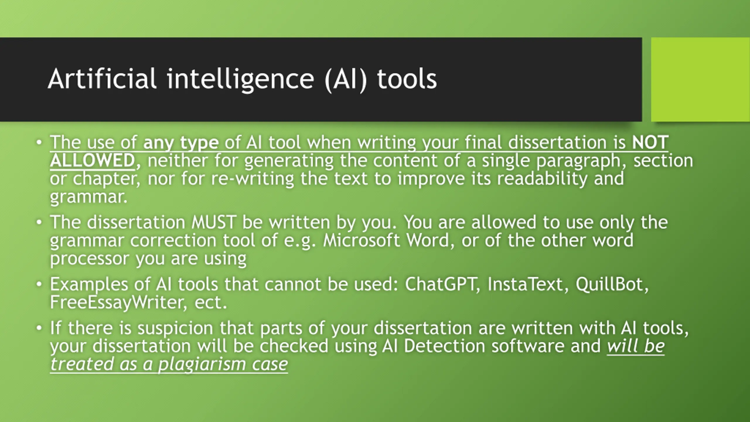 Artificial intelligence (AI) tools The use of any type of AI tool when writing your final dissertation is NOT ALLOWED, neither for generating the content of a single paragraph, section or chapter, nor for re-writing the text to improve its readability and grammar. The dissertation MUST be written by you. You are allowed to use only the grammar correction tool of e.g. Microsoft Word, or of the other word processor you are using Examples of AI tools that cannot be used: ChatGPT, InstaText, QuillBot, FreeEssayWriter, ect. If there is suspicion that parts of your dissertation are written with AI tools, your dissertation will be checked using AI Detection software and will be treated as a plagiarism case