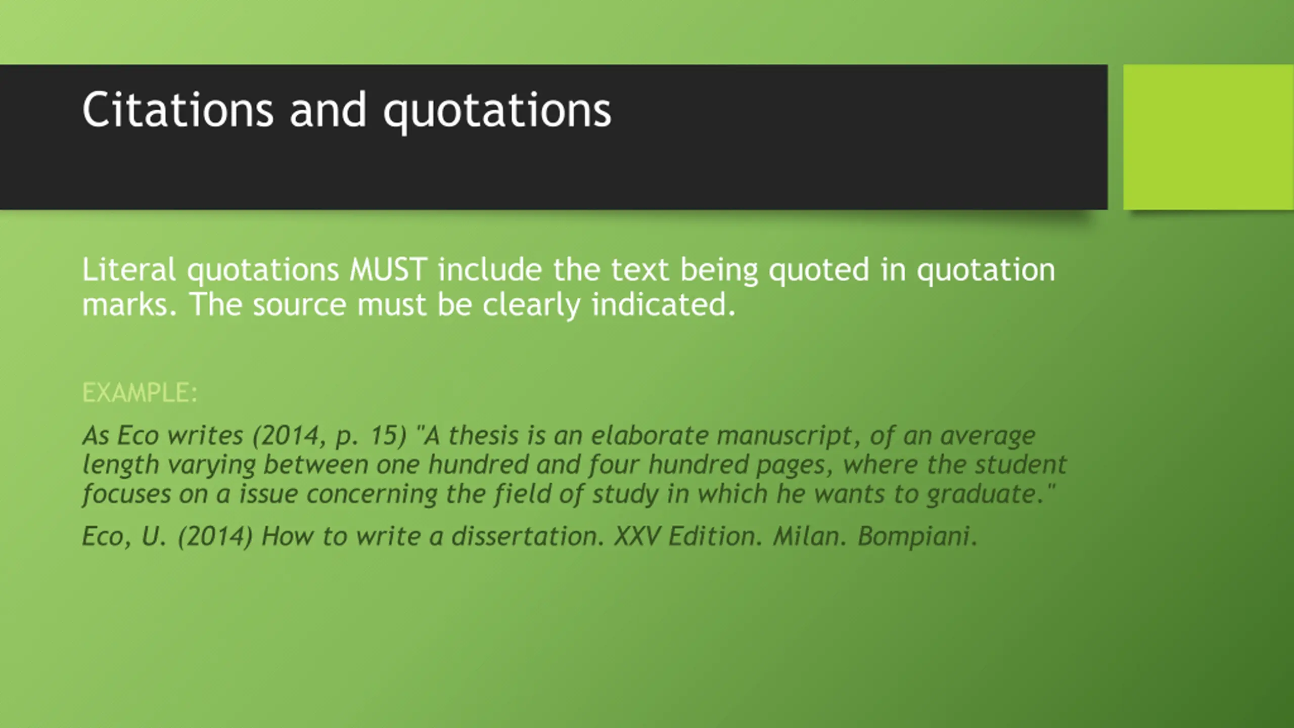 Citations and quotations Literal quotations MUST include the text being quoted in quotation marks. The source must be clearly indicated. EXAMPLE: As Eco writes (2014, p. 15) "A thesis is an elaborate manuscript, of an average length varying between one hundred and four hundred pages, where the student focuses on a issue concerning the field of study in which he wants to graduate." Eco, U. (2014) How to write a dissertation. XXV Edition. Milan. Bompiani.