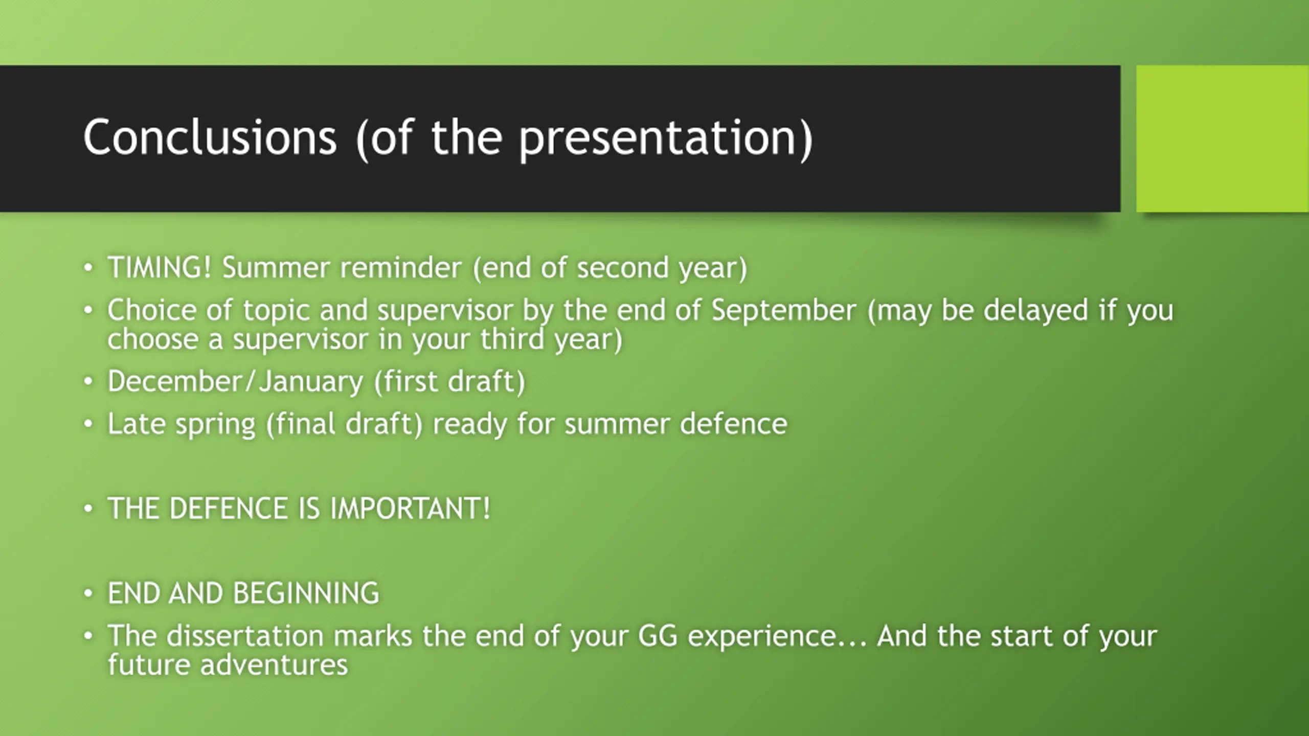 Conclusions (of the presentation) TIMING! Summer reminder (end of second year) Choice of topic and supervisor by the end of September (may be delayed if you choose a supervisor in your third year) December/January (first draft) Late spring (final draft) ready for summer defence THE DEFENCE IS IMPORTANT! END AND BEGINNING The dissertation marks the end of your GG experience... And the start of your future adventures