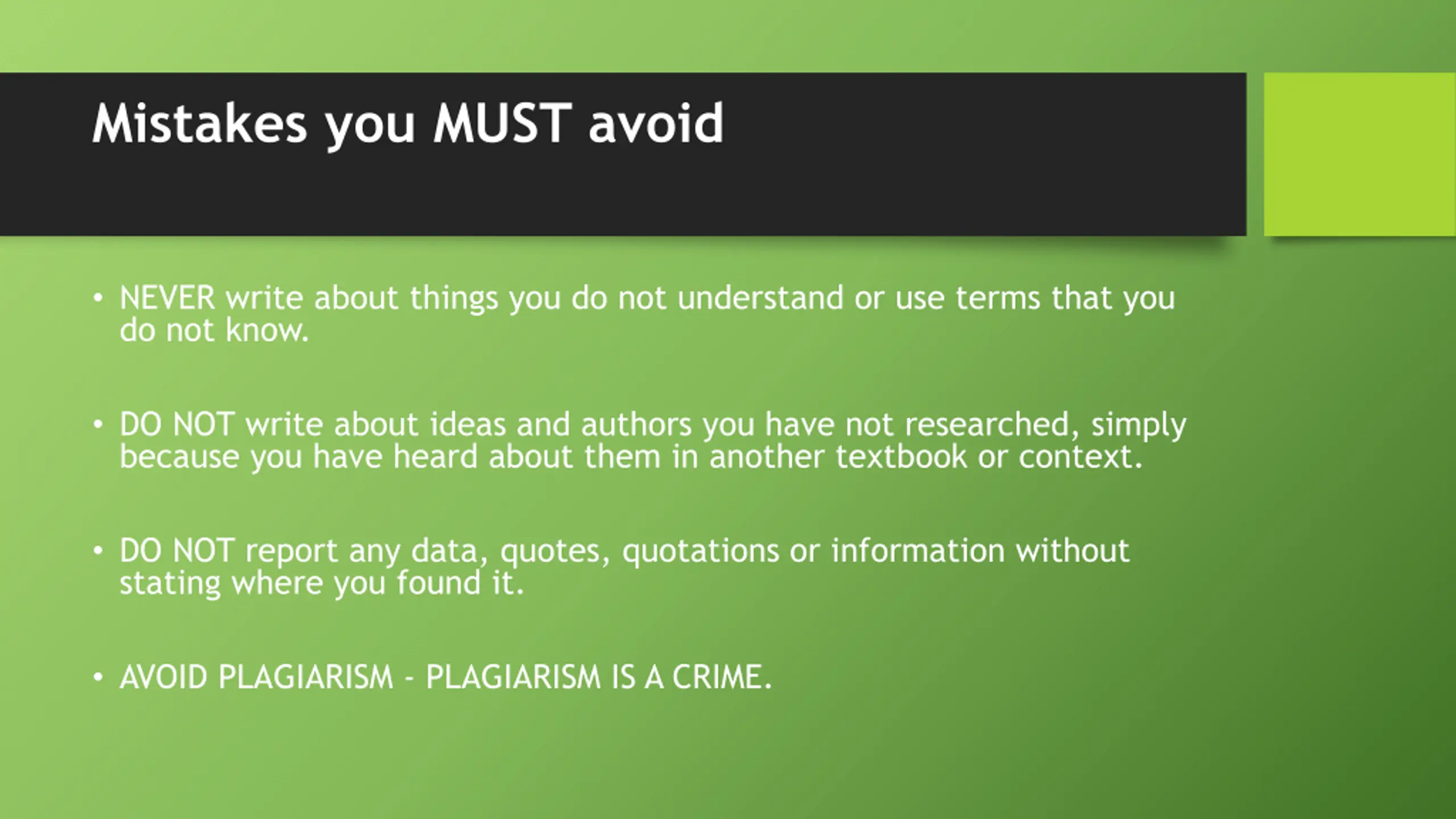 Mistakes you MUST avoid NEVER write about things you do not understand or use terms that you do not know. DO NOT write about ideas and authors you have not researched, simply because you have heard about them in another textbook or context. DO NOT report any data, quotes, quotations or information without stating where you found it. AVOID PLAGIARISM - PLAGIARISM IS A CRIME.