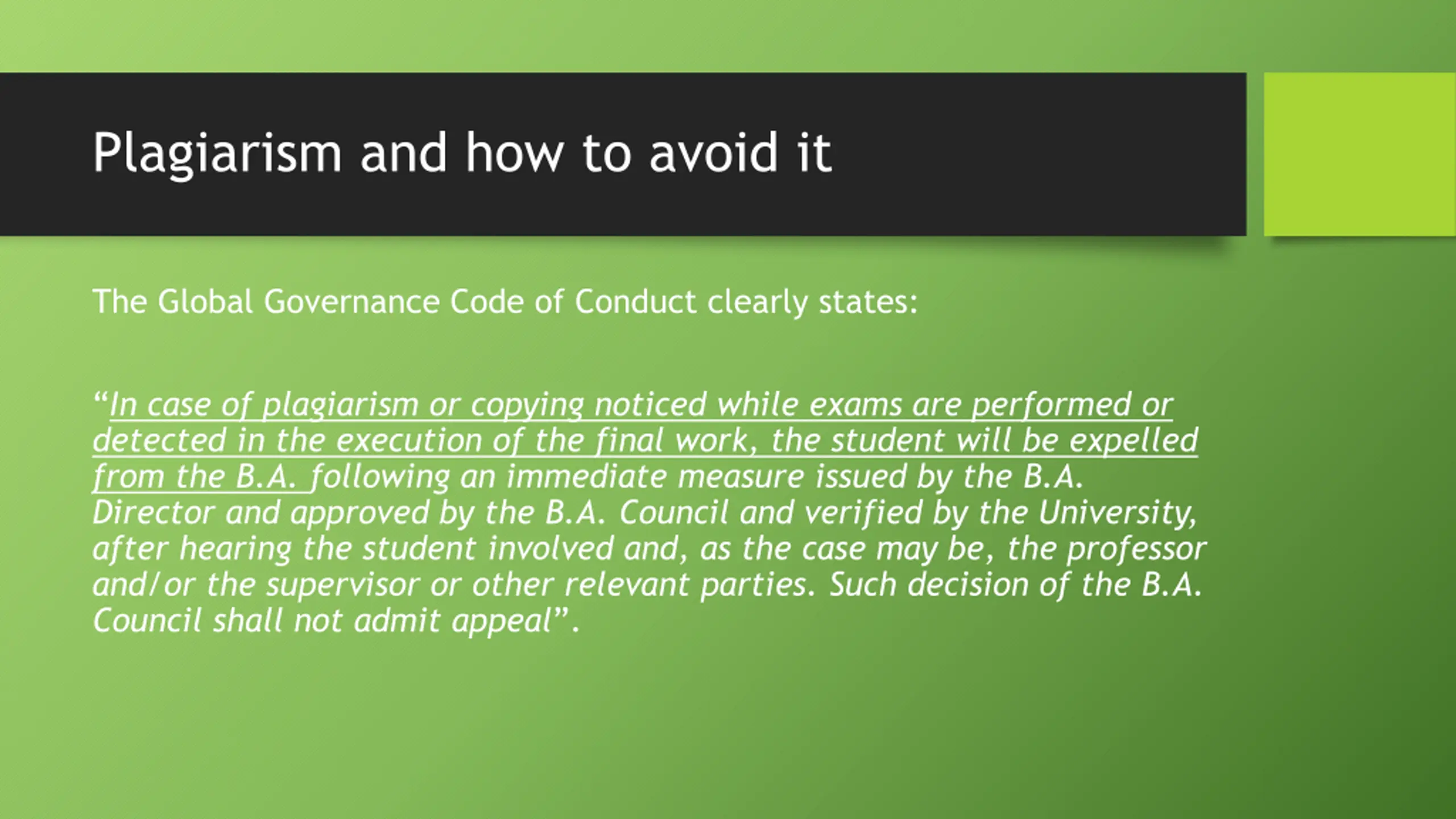 Plagiarism and how to avoid it The Global Governance Code of Conduct clearly states: In case of plagiarism or copying noticed while exams are performed or detected in the execution of the final work, the student will be expelled from the B.A. following an immediate measure issued by the B.A. Director and approved by the B.A. Council and verified by the University, after hearing the student involved and, as the case may be, the professor and/or the supervisor or other relevant parties. Such decision of the B.A. Council shall not admit appeal .