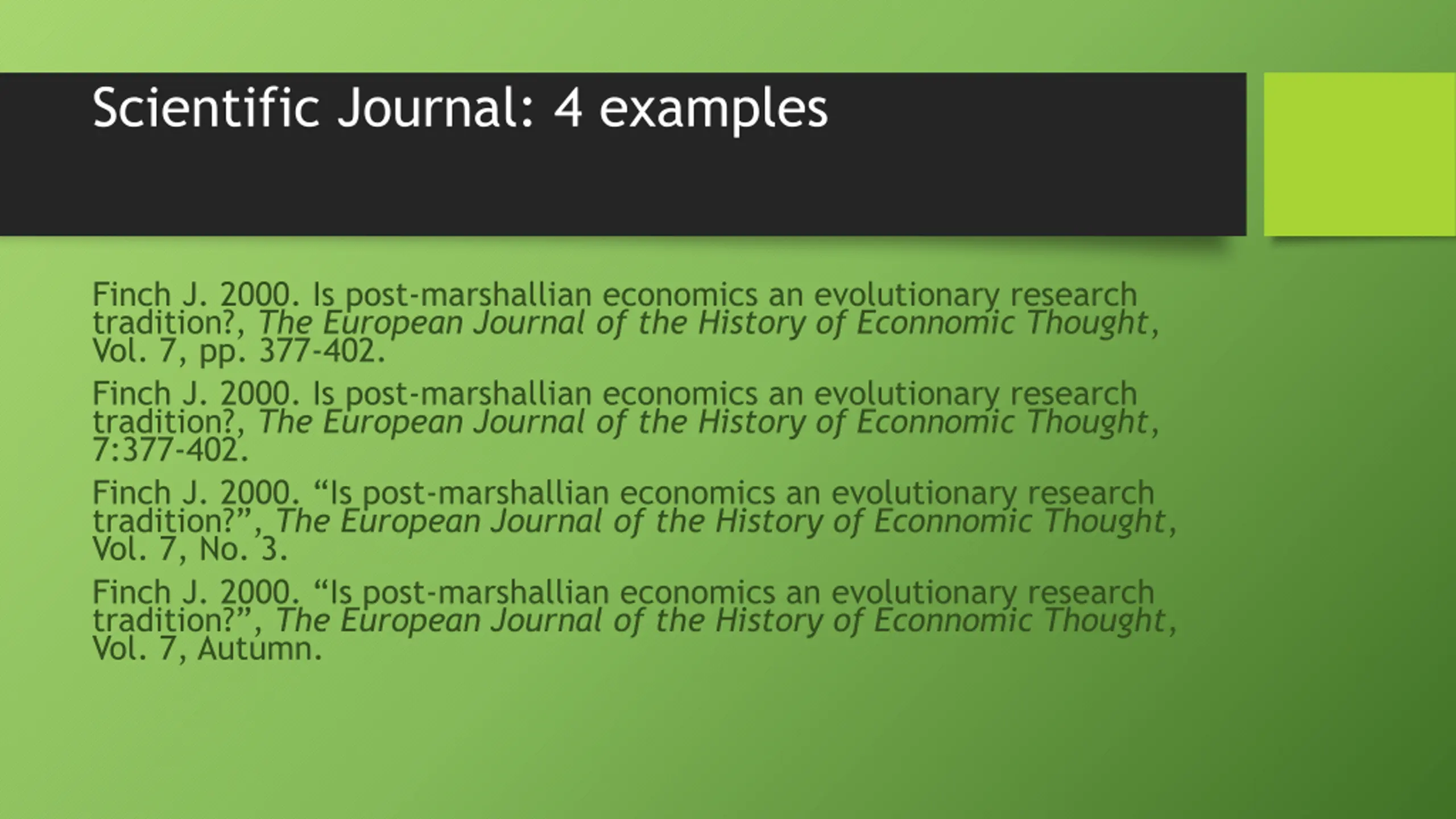 Scientific Journal: 4 examples Finch J. 2000. Is post-marshallian economics an evolutionary research tradition?, The European Journal of the History of Econnomic Thought, Vol. 7, pp. 377-402. Finch J. 2000. Is post-marshallian economics an evolutionary research tradition?, The European Journal of the History of Econnomic Thought, 7:377-402. Finch J. 2000. Is post-marshallian economics an evolutionary research tradition? , The European Journal of the History of Econnomic Thought, Vol. 7, No. 3. Finch J. 2000. Is post-marshallian economics an evolutionary research tradition? , The European Journal of the History of Econnomic Thought, Vol. 7, Autumn.