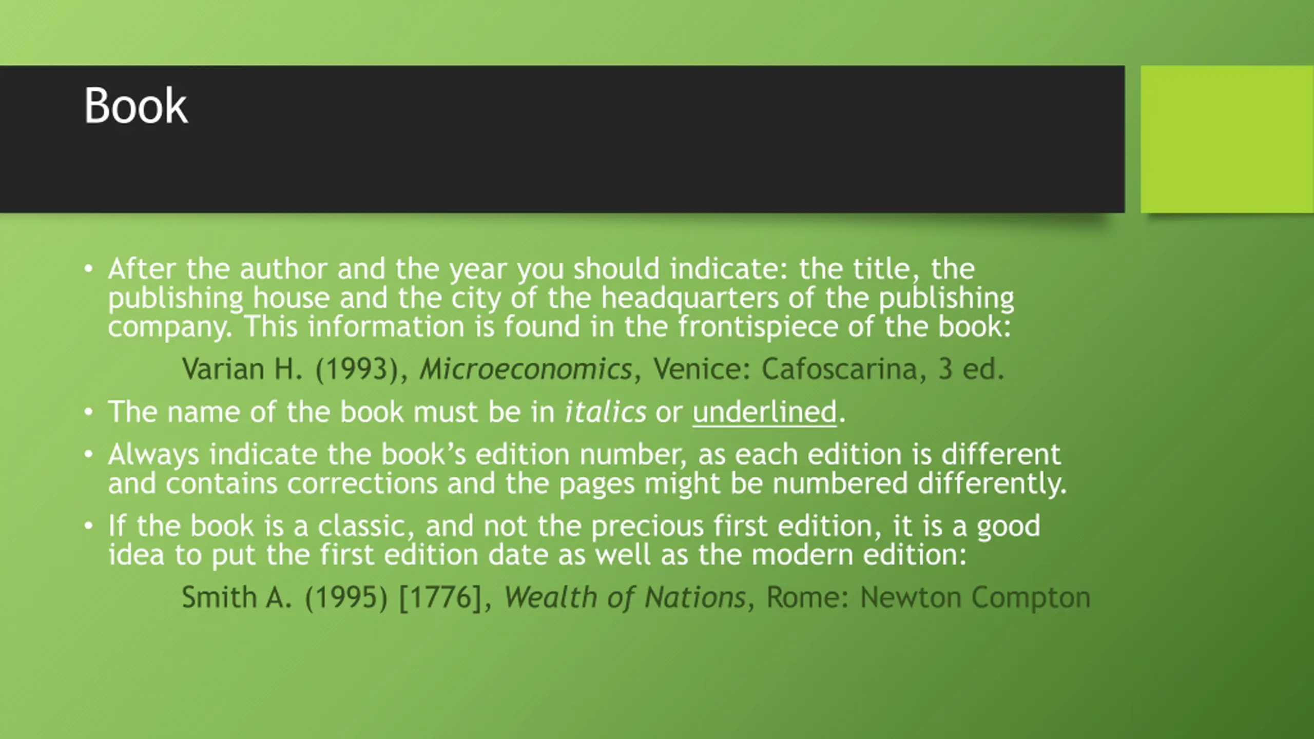 Book After the author and the year you should indicate: the title, the publishing house and the city of the headquarters of the publishing company. This information is found in the frontispiece of the book: Varian H. (1993), Microeconomics, Venice: Cafoscarina, 3 ed. The name of the book must be in italics or underlined. Always indicate the book s edition number, as each edition is different and contains corrections and the pages might be numbered differently. If the book is a classic, and not the precious first edition, it is a good idea to put the first edition date as well as the modern edition: Smith A. (1995) [1776], Wealth of Nations, Rome: Newton Compton