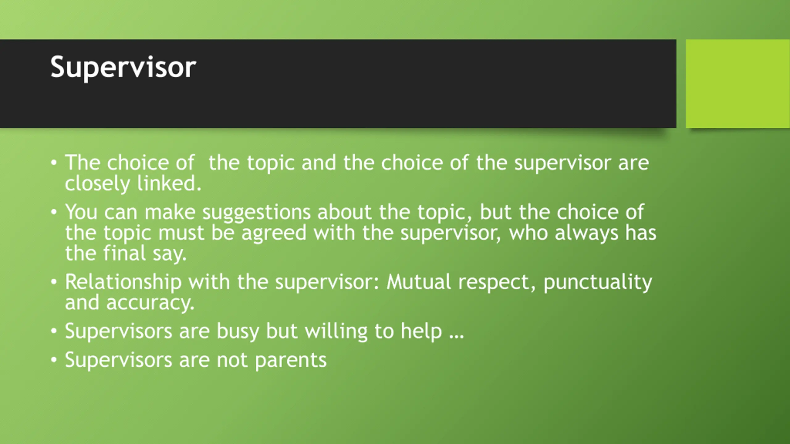 Supervisor The choice of the topic and the choice of the supervisor are closely linked. You can make suggestions about the topic, but the choice of the topic must be agreed with the supervisor, who always has the final say. Relationship with the supervisor: Mutual respect, punctuality and accuracy. Supervisors are busy but willing to help Supervisors are not parents
