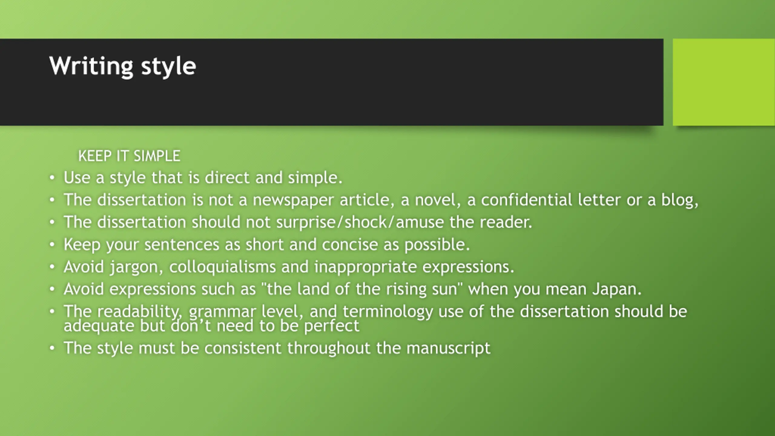 Writing style KEEP IT SIMPLE Use a style that is direct and simple. The dissertation is not a newspaper article, a novel, a confidential letter or a blog, The dissertation should not surprise/shock/amuse the reader. Keep your sentences as short and concise as possible. Avoid jargon, colloquialisms and inappropriate expressions. Avoid expressions such as "the land of the rising sun" when you mean Japan. The readability, grammar level, and terminology use of the dissertation should be adequate but don t need to be perfect The style must be consistent throughout the manuscript