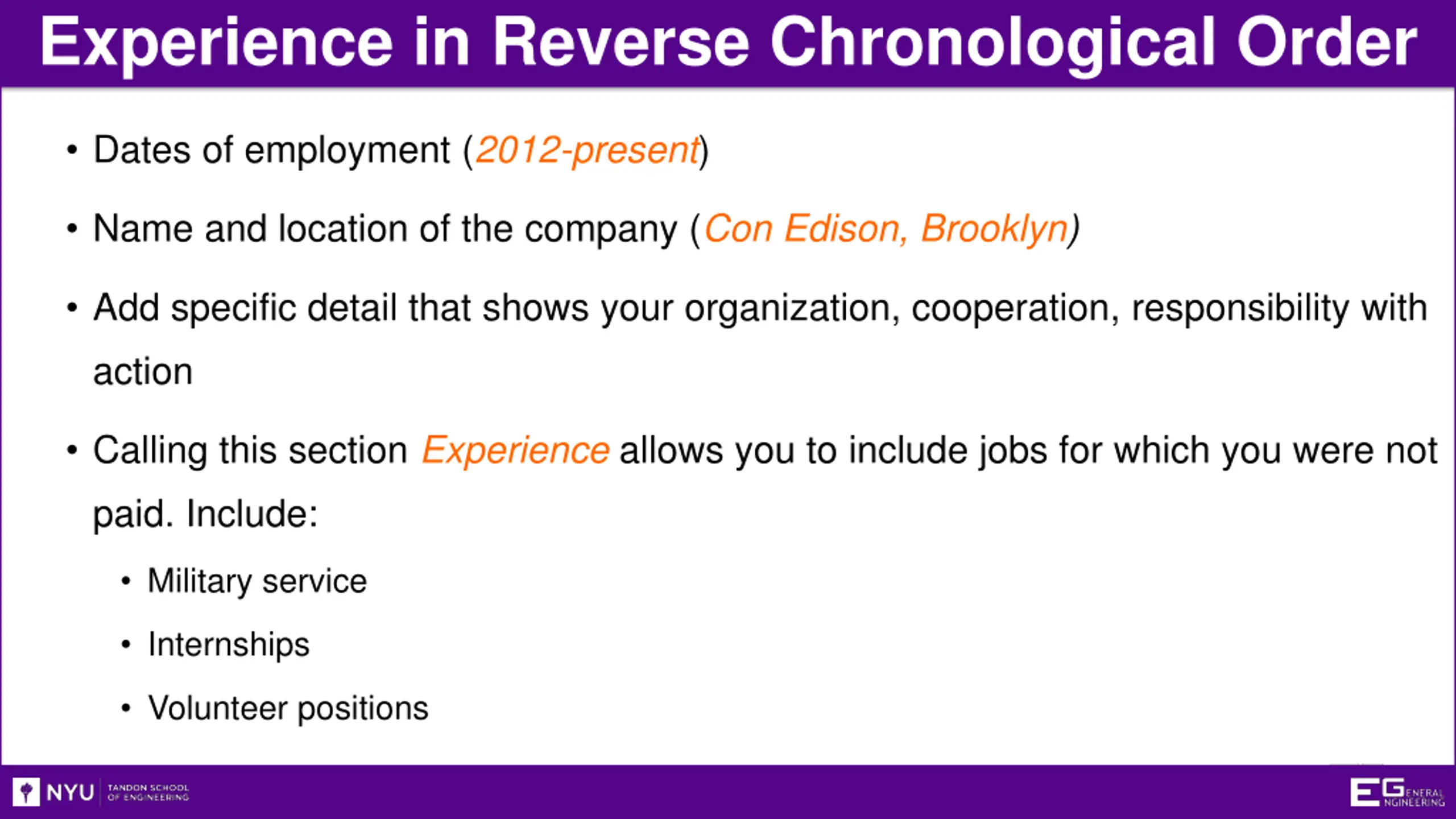 Experience in Reverse Chronological Order Dates of employment (2012-present) Name and location of the company (Con Edison, Brooklyn) Add specific detail that shows your organization, cooperation, responsibility with action Calling this section Experience allows you to include jobs for which you were not paid. Include: Military service Internships Volunteer positions