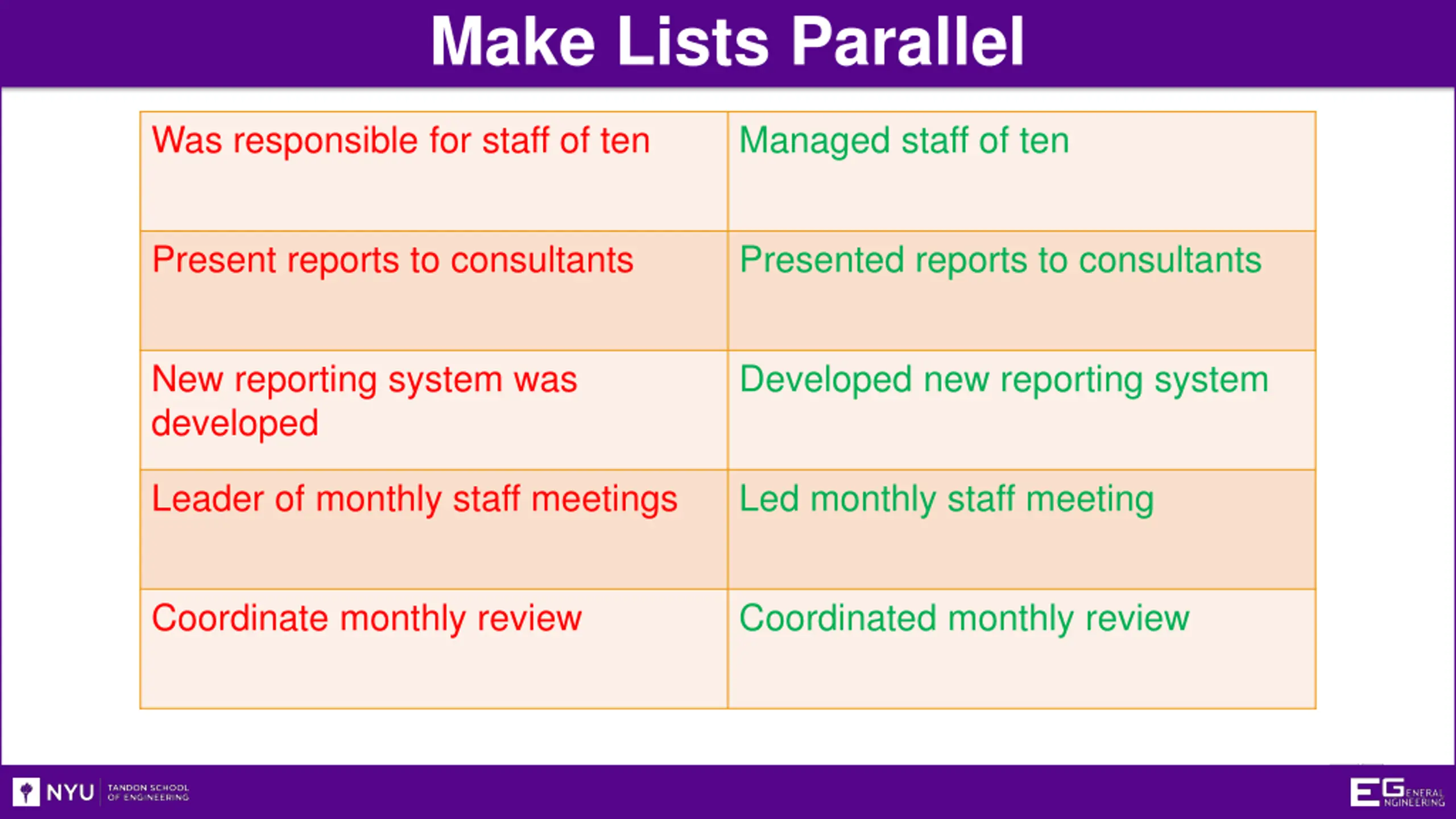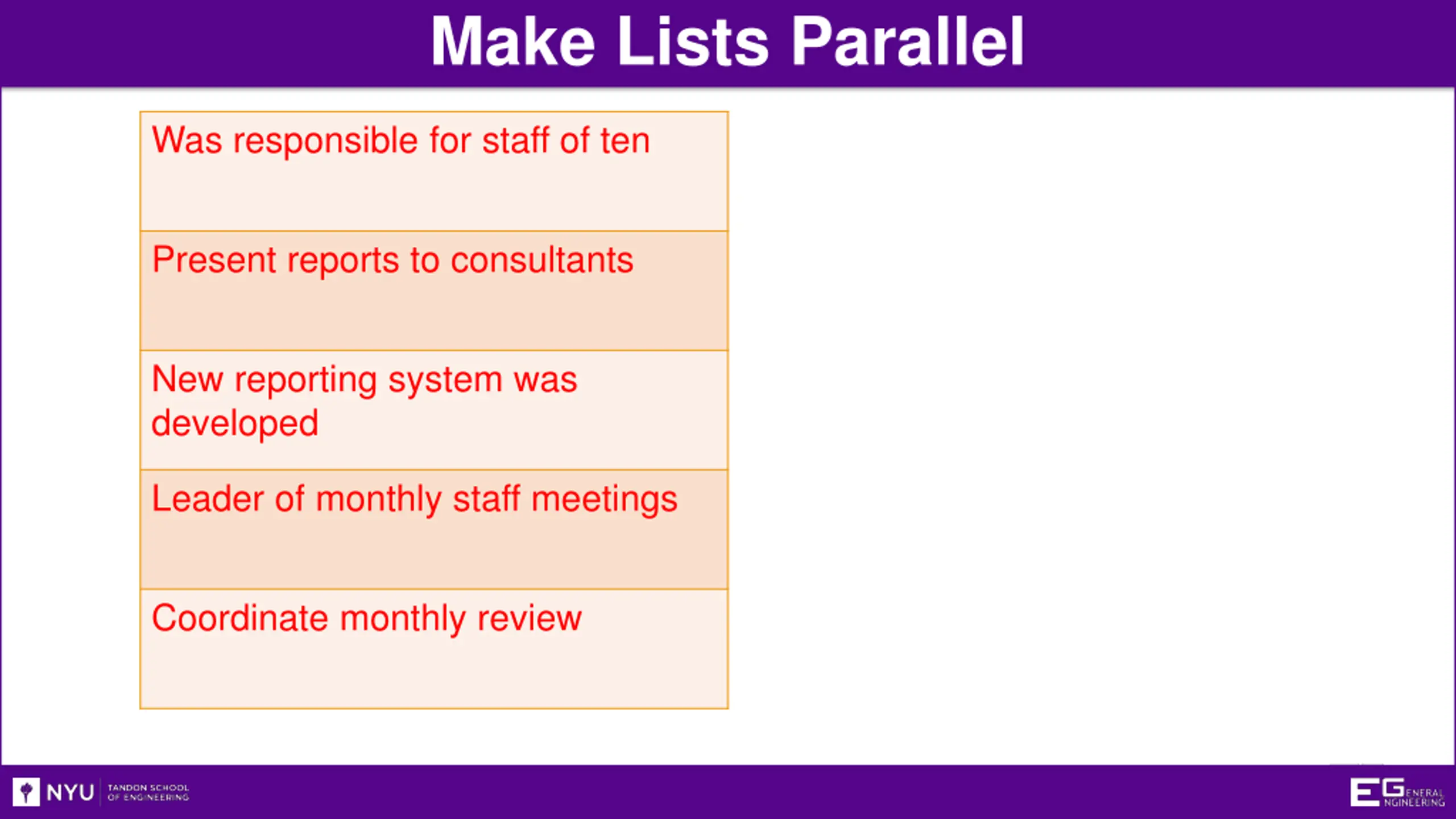 Make Lists Parallel Was responsible for staff of ten Managed staff of ten Present reports to consultants Presented reports to consultants New reporting system was developed Developed new reporting system Leader of monthly staff meetings Led monthly staff meeting Coordinate monthly review Coordinated monthly review