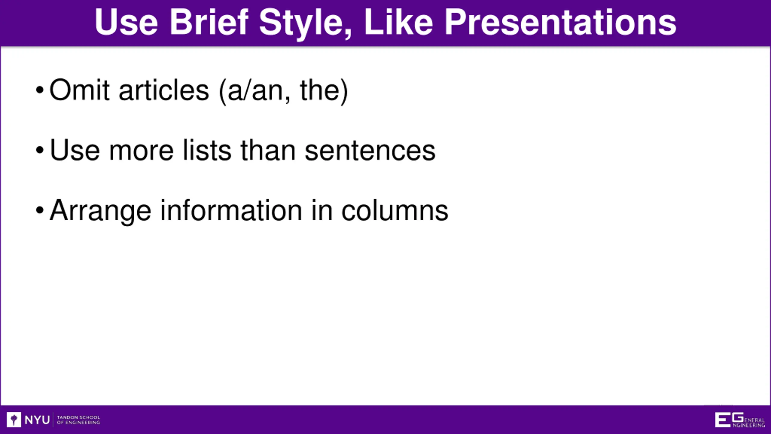 Use Brief Style, Like Presentations Omit articles (a/an, the) Use more lists than sentences Arrange information in columns