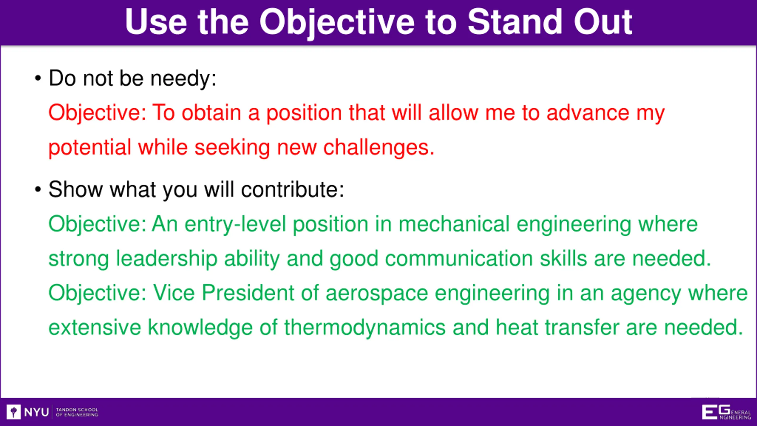 Use the Objective to Stand Out Do not be needy: Objective: To obtain a position that will allow me to advance my potential while seeking new challenges. Show what you will contribute: Objective: An entry-level position in mechanical engineering where strong leadership ability and good communication skills are needed. Objective: Vice President of aerospace engineering in an agency where extensive knowledge of thermodynamics and heat transfer are needed.