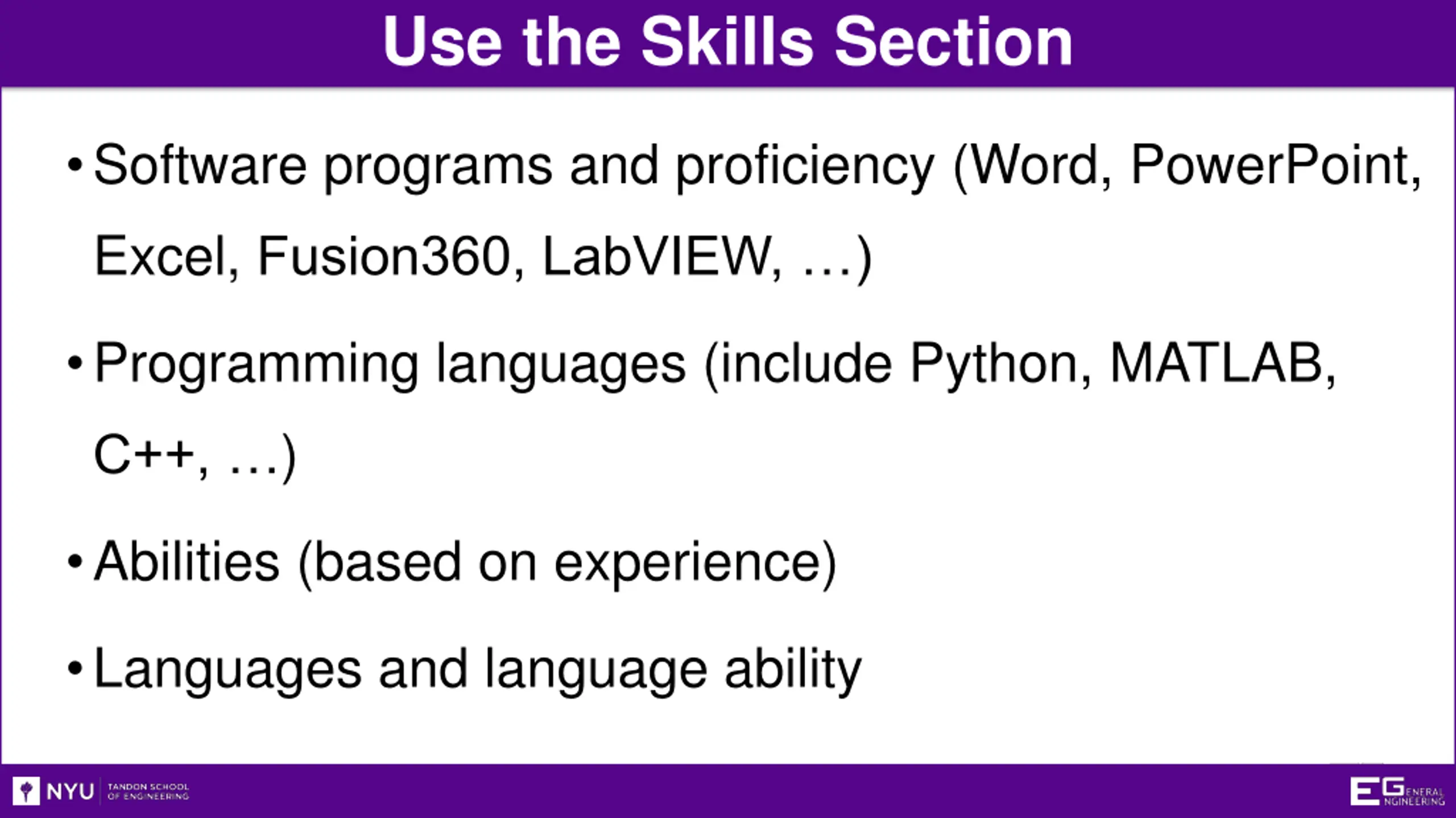 Use the Skills Section Software programs and proficiency (Word, PowerPoint, Excel, Fusion360, LabVIEW, ) Programming languages (include Python, MATLAB, C++, ) Abilities (based on experience) Languages and language ability