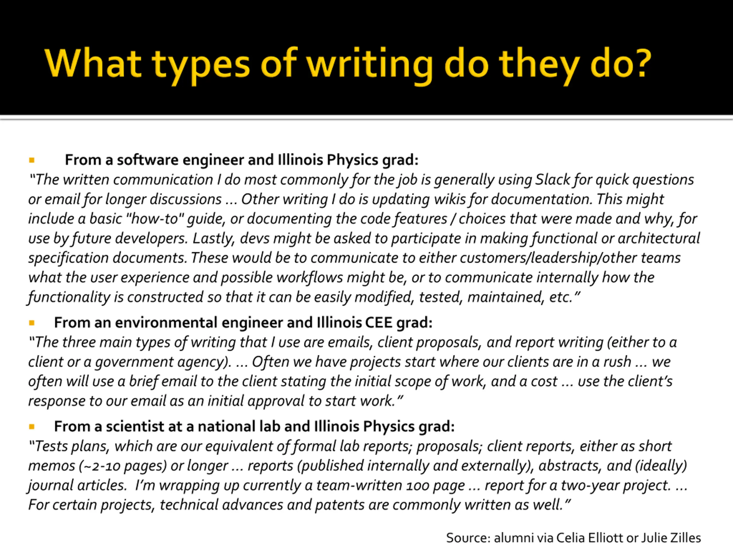 From a software engineer and Illinois Physics grad: The written communication I do most commonly for the job is generally using Slack for quick questions or email for longer discussions Other writing I do is updating wikis for documentation. This might include a basic "how-to" guide, or documenting the code features / choices that were made and why, for use by future developers. Lastly, devs might be asked to participate in making functional or architectural specification documents. These would be to communicate to either customers/leadership/other teams what the user experience and possible workflows might be, or to communicate internally how the functionality is constructed so that it can be easily modified, tested, maintained, etc. From an environmental engineer and Illinois CEE grad: The three main types of writing that I use are emails, client proposals, and report writing (either to a client or a government agency). Often we have projects start where our clients are in a rush we often will use a brief email to the client stating the initial scope of work, and a cost use the client s response to our email as an initial approval to start work. From a scientist at a national lab and Illinois Physics grad: Tests plans, which are our equivalent of formal lab reports; proposals; client reports, either as short memos (~2-10 pages) or longer reports (published internally and externally), abstracts, and (ideally) journal articles. I m wrapping up currently a team-written 100 page report for a two-year project. For certain projects, technical advances and patents are commonly written as well. Source: alumni via Celia Elliott or Julie Zilles