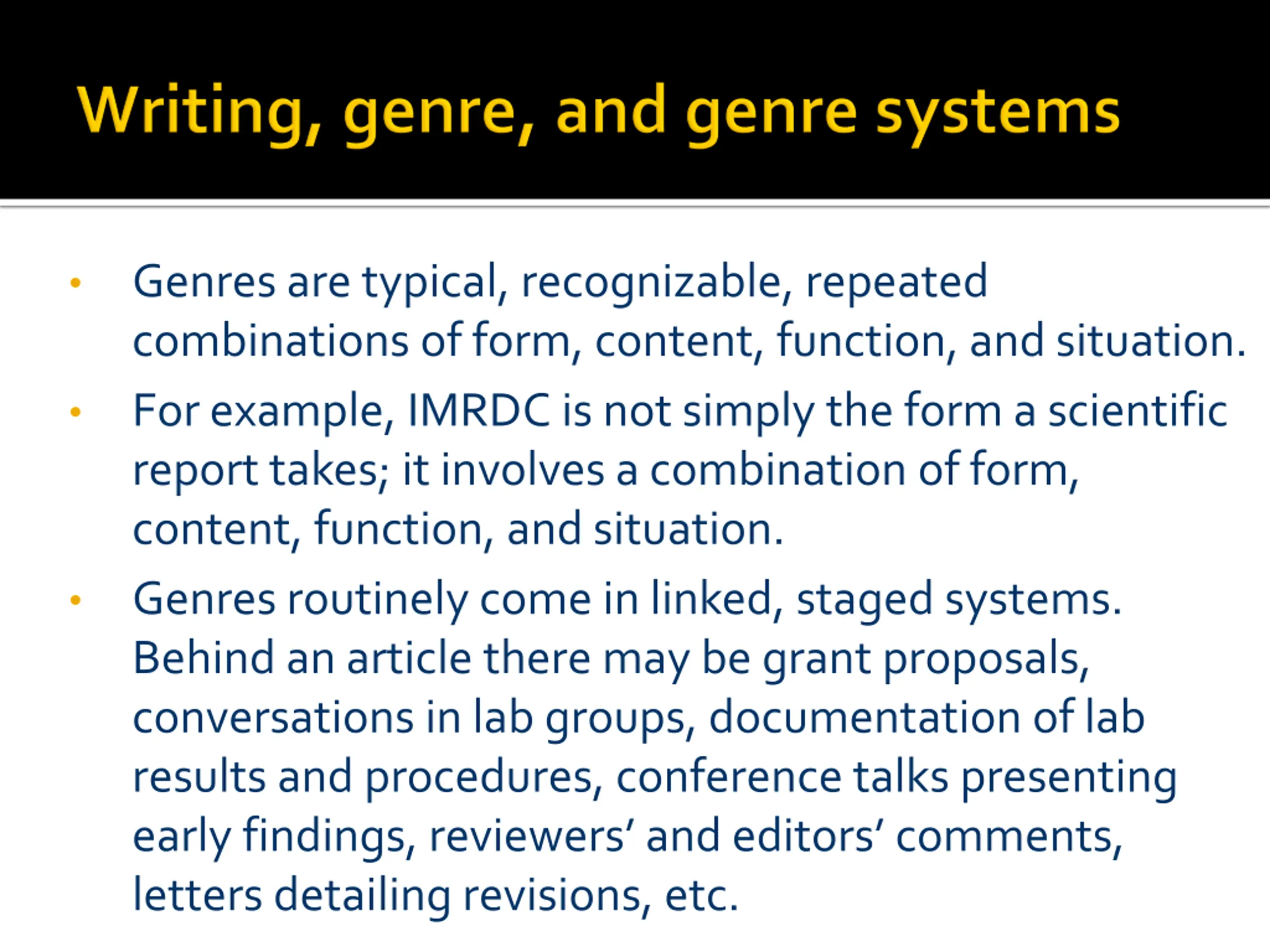 Genres are typical, recognizable, repeated combinations of form, content, function, and situation. For example, IMRDC is not simply the form a scientific report takes; it involves a combination of form, content, function, and situation. Genres routinely come in linked, staged systems. Behind an article there may be grant proposals, conversations in lab groups, documentation of lab results and procedures, conference talks presenting early findings, reviewers and editors comments, letters detailing revisions, etc.