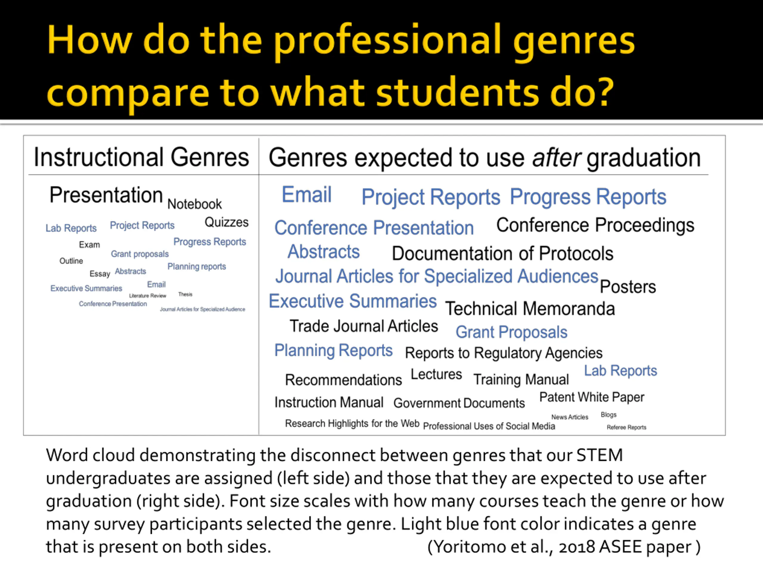 Word cloud demonstrating the disconnect between genres that our STEM undergraduates are assigned (left side) and those that they are expected to use after graduation (right side). Font size scales with how many courses teach the genre or how many survey participants selected the genre. Light blue font color indicates a genre that is present on both sides. (Yoritomo et al., 2018 ASEE paper )