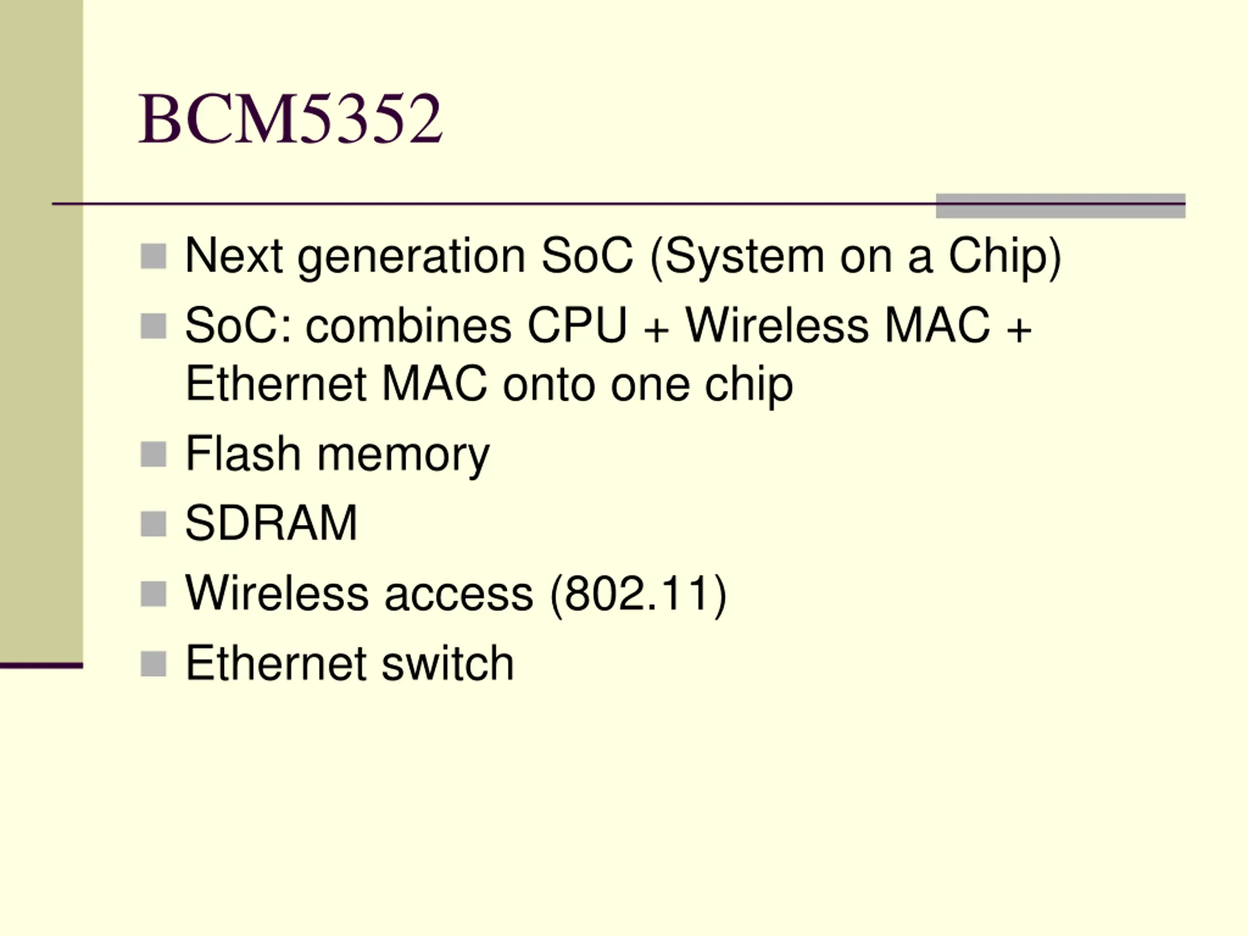 BCM5352 Next generation SoC (System on a Chip) SoC: combines CPU + Wireless MAC + Ethernet MAC onto one chip Flash memory SDRAM Wireless access (802.11) Ethernet switch