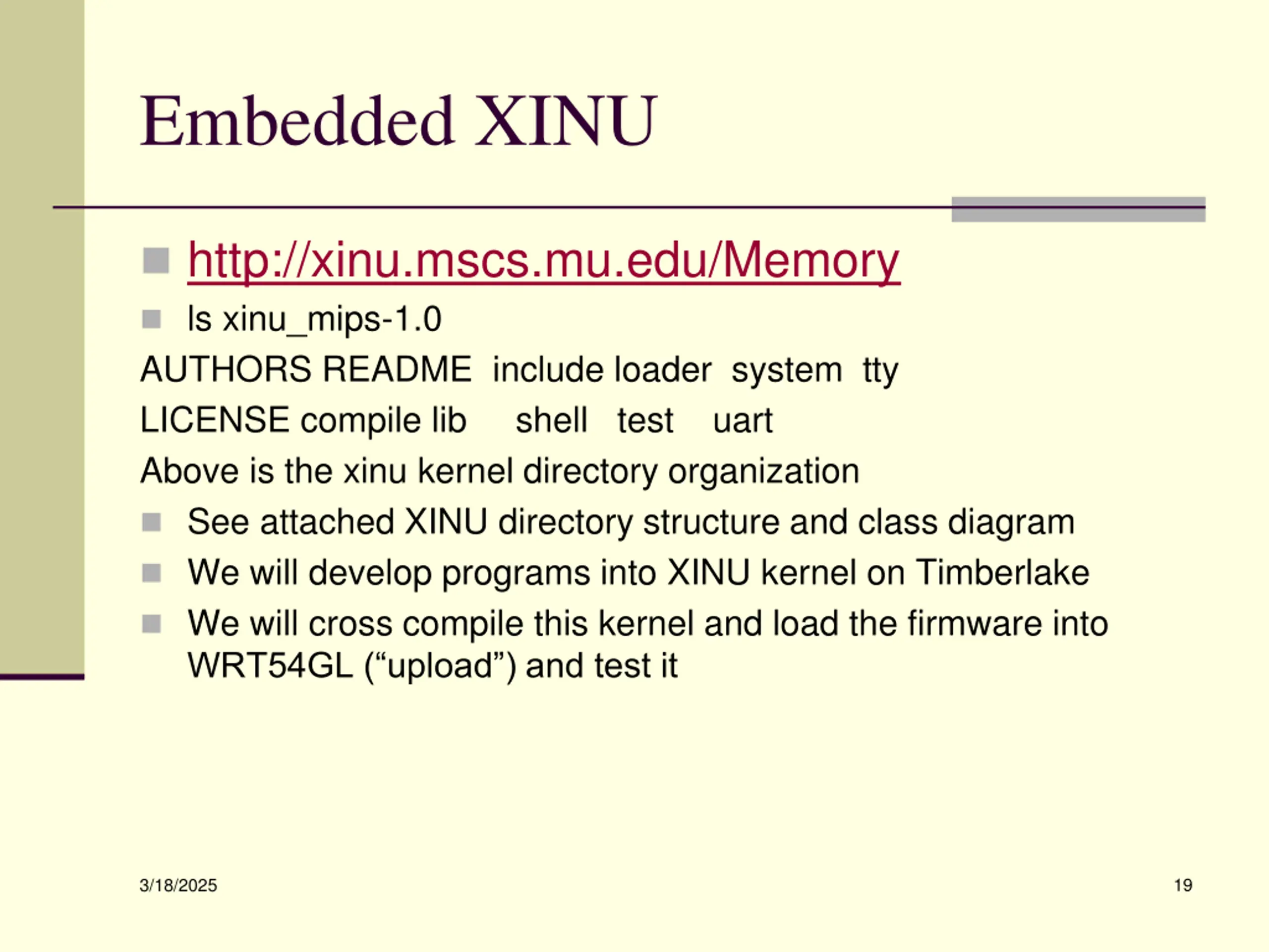 Embedded XINU http://xinu.mscs.mu.edu/Memory ls xinu_mips-1.0 AUTHORS README include loader system tty LICENSE compile lib shell test uart Above is the xinu kernel directory organization See attached XINU directory structure and class diagram We will develop programs into XINU kernel on Timberlake We will cross compile this kernel and load the firmware into WRT54GL ( upload ) and test it 19 3/18/2025