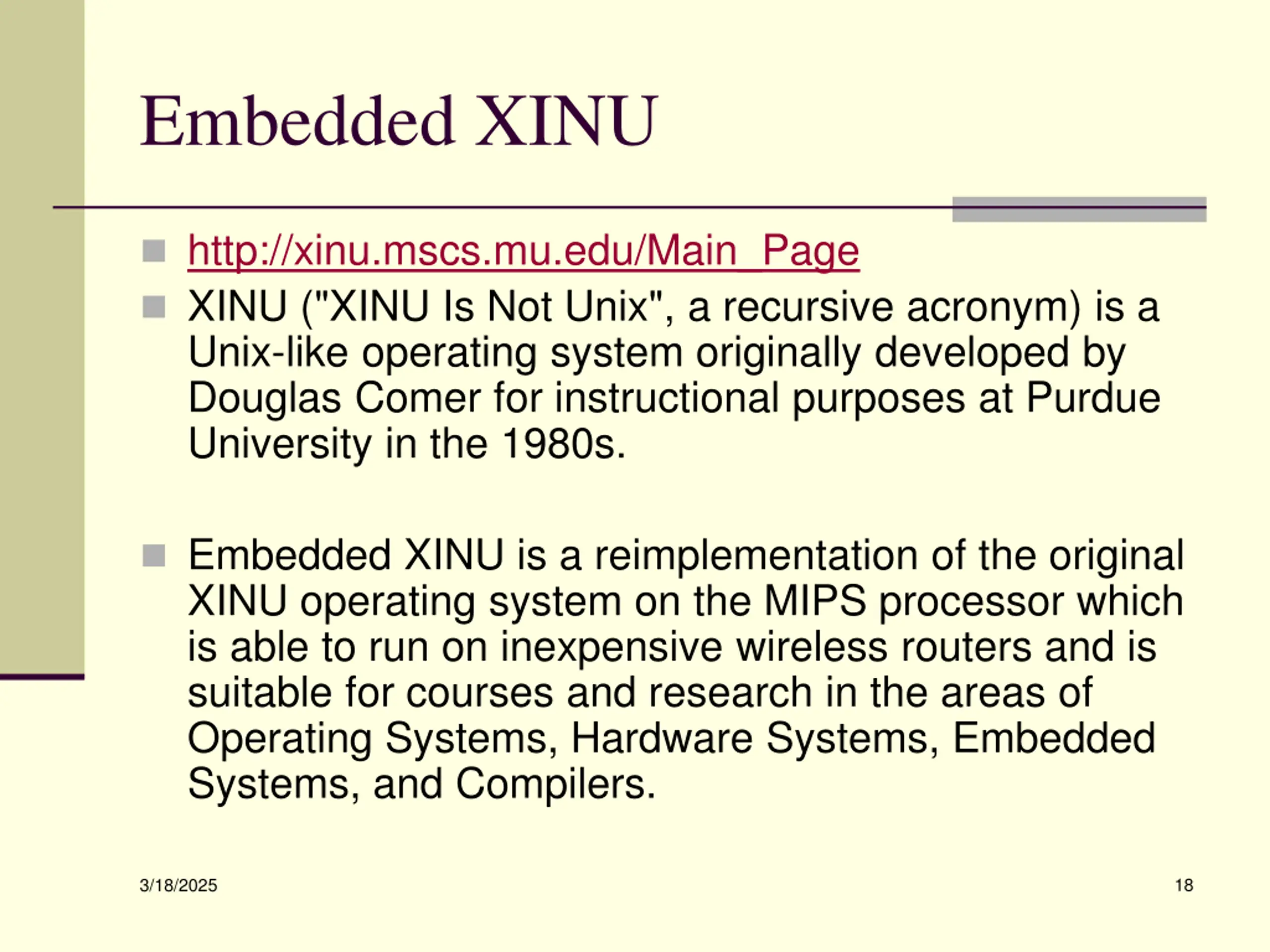 Embedded XINU http://xinu.mscs.mu.edu/Main_Page XINU ("XINU Is Not Unix", a recursive acronym) is a Unix-like operating system originally developed by Douglas Comer for instructional purposes at Purdue University in the 1980s. Embedded XINU is a reimplementation of the original XINU operating system on the MIPS processor which is able to run on inexpensive wireless routers and is suitable for courses and research in the areas of Operating Systems, Hardware Systems, Embedded Systems, and Compilers. 18 3/18/2025