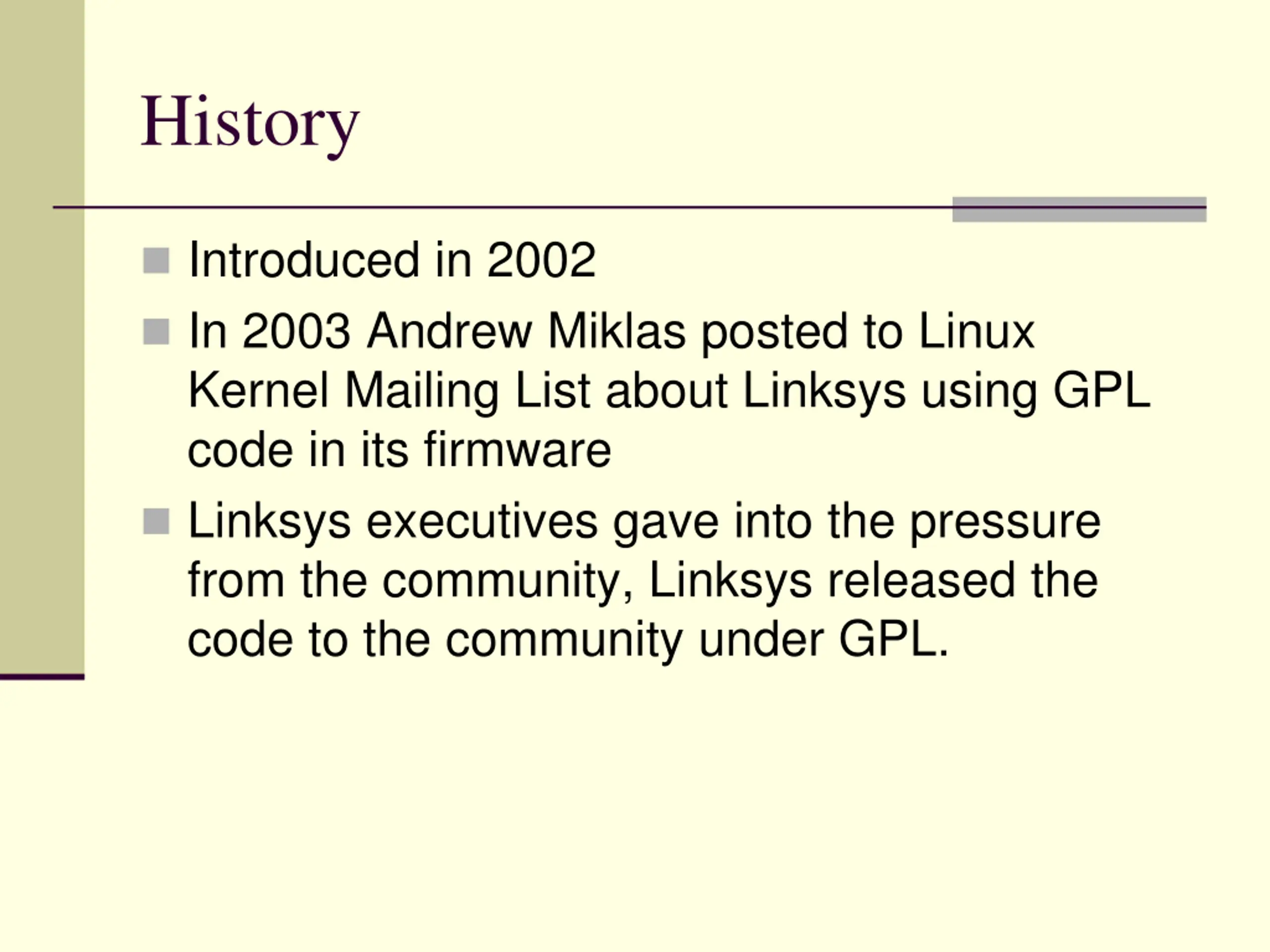 History Introduced in 2002 In 2003 Andrew Miklas posted to Linux Kernel Mailing List about Linksys using GPL code in its firmware Linksys executives gave into the pressure from the community, Linksys released the code to the community under GPL.